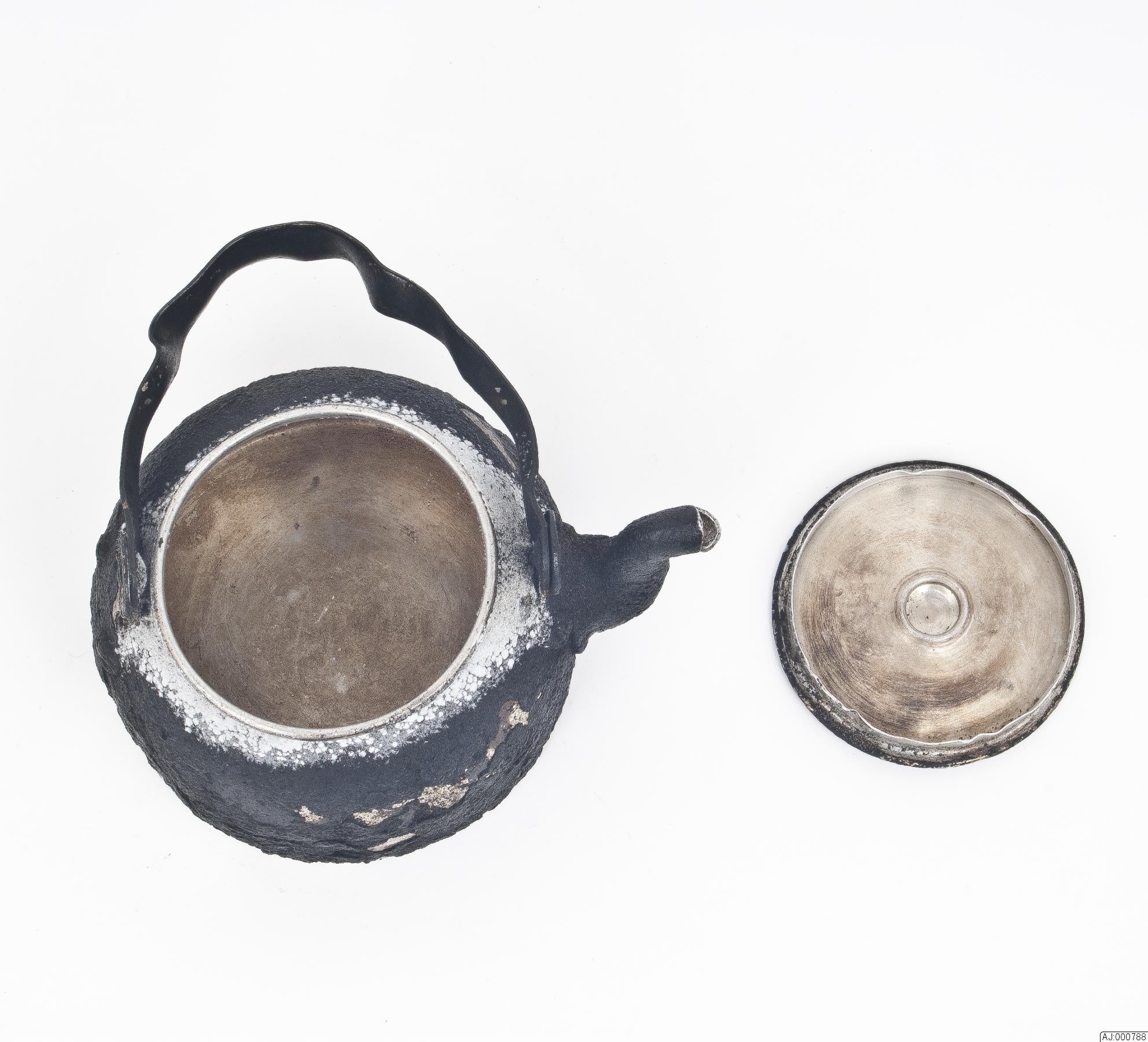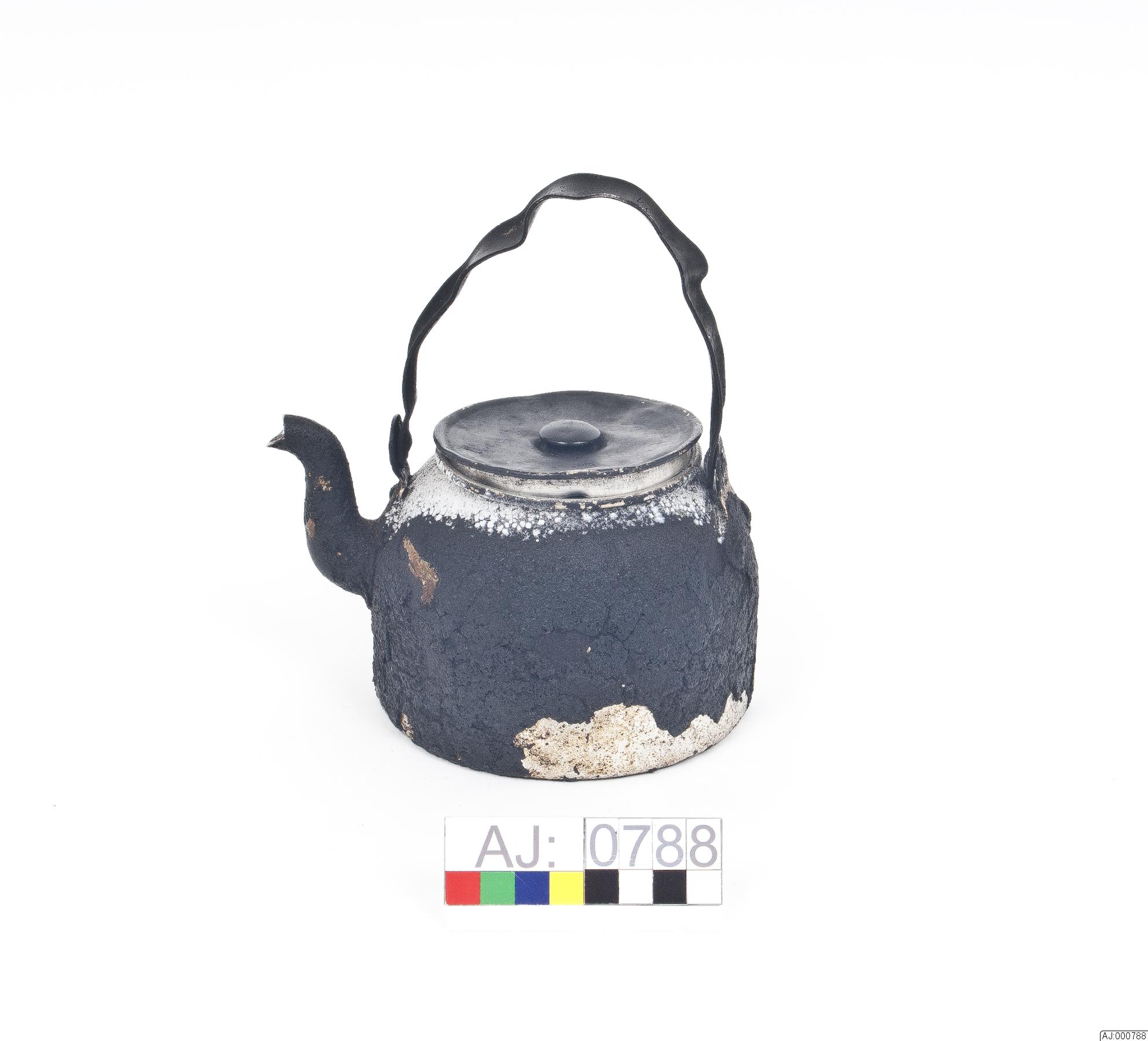 Kaffepanna, med knoppförsett lock, av aluminium. Pannan är cylindrisk och något avsmalnande mot mynningen. Pannans handtag är rörligt och sitter fästat vid två fastnitade, klöverformade metallfästen. Pipen är S-formad. Pannan förvaras i en påse av oblekt bomullstyg.