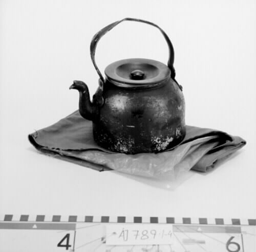- AJ:000789:1-4 kaffepanna, med lock, av aluminium. Locket har en metallknopp och dess centrum är något försänkt. Pannan är cylindrisk och något avsmalnande mot mynningen. Pannans handtag är rörligt och sitter fästat vid två fastnitade klöverformade metallfästen. Pipen är S-formad. Pannan förvaras i en plastpåse och en påse av grönt bomullstyg.