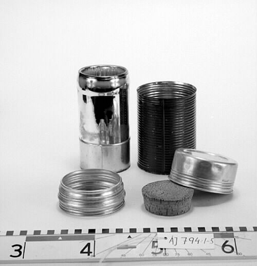 Insatsen fixeras med en ring av aluminium. Till termosen hör ett innerlock av kork och ett yttre skruvlock av aluminium.