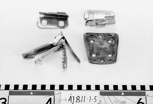 Skidbindning av aluminium av Kandahartyp. Bindningen består av ett tåjärn i tre delar samt en fäst- och spännanordning för kabel. På tåjärnets bottenplatta präglad text, bla: "Markus, högsta kvalité". Bindningens delar hålls samman med ett snöre i vilket en pappersetikett sitter fästad. Etiketten har tryckt och handskriven text, bla"Emottagit 1 p. Skidor För Rep".