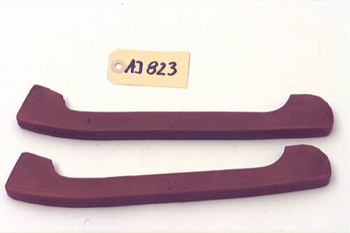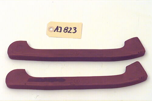 Ett par skridskoskydd av tegelröd gummi. Skydden har en skära för skridskoskenan, rundad framkant, rak bakkant samt mönstrad undersida.