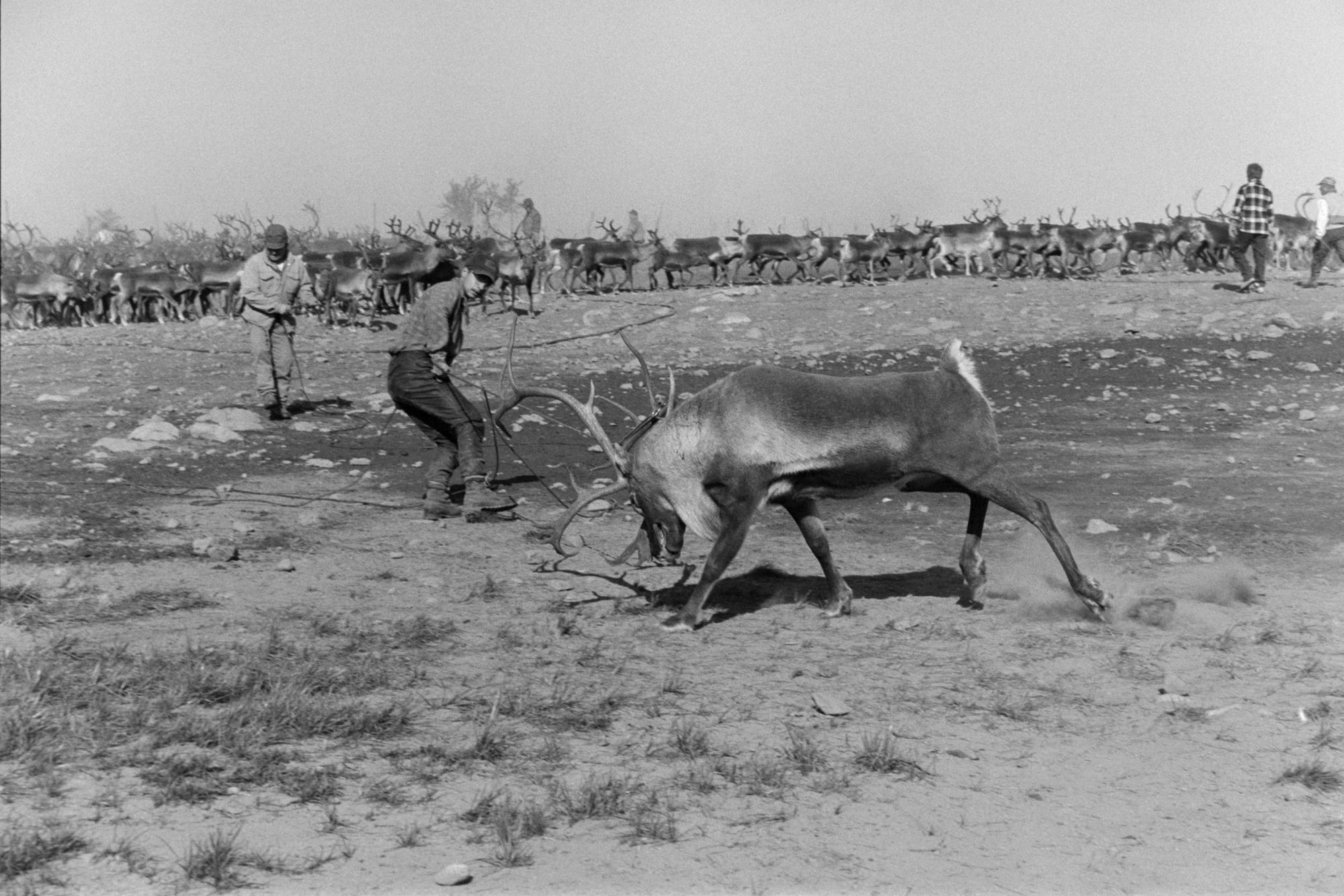Sarvslakt. Renskötare har med lasso kastat fast en sarv, hanren, som kommer att slaktas. Samefolket nr. 9 1992.