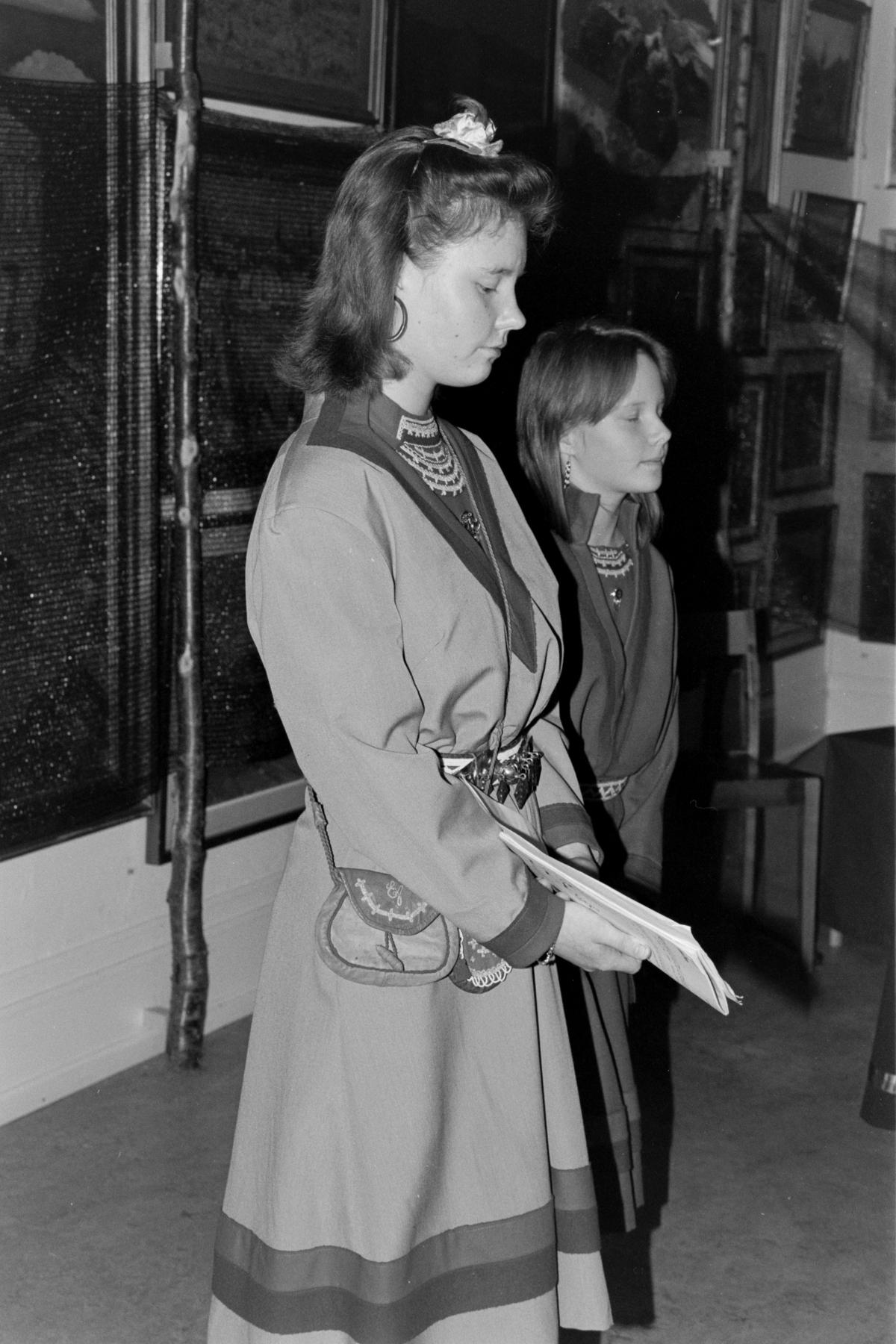 Flickor klädda i sydsamiska koltar sjunger på invigning av Jämtlands länsmuseums samiska avdelning. Samefolket nr. 10 1992.