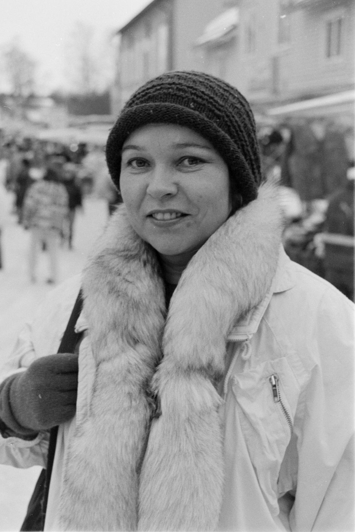 Kvinna på Jokkmokks vintermarknad iklädd varma vinterkläder. Samefolket nr. 2 1992.