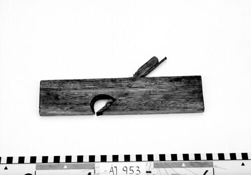- Hyvel bestående av en rektangulär, smal träbit med ett snedställt genomgående hål från den ena till den andra långsidan. I hålet är hyveljärnet fastsatt med hjälp av en träkil. Framför hyvelns blad finns ett halvcirkelformat genomgående hål.