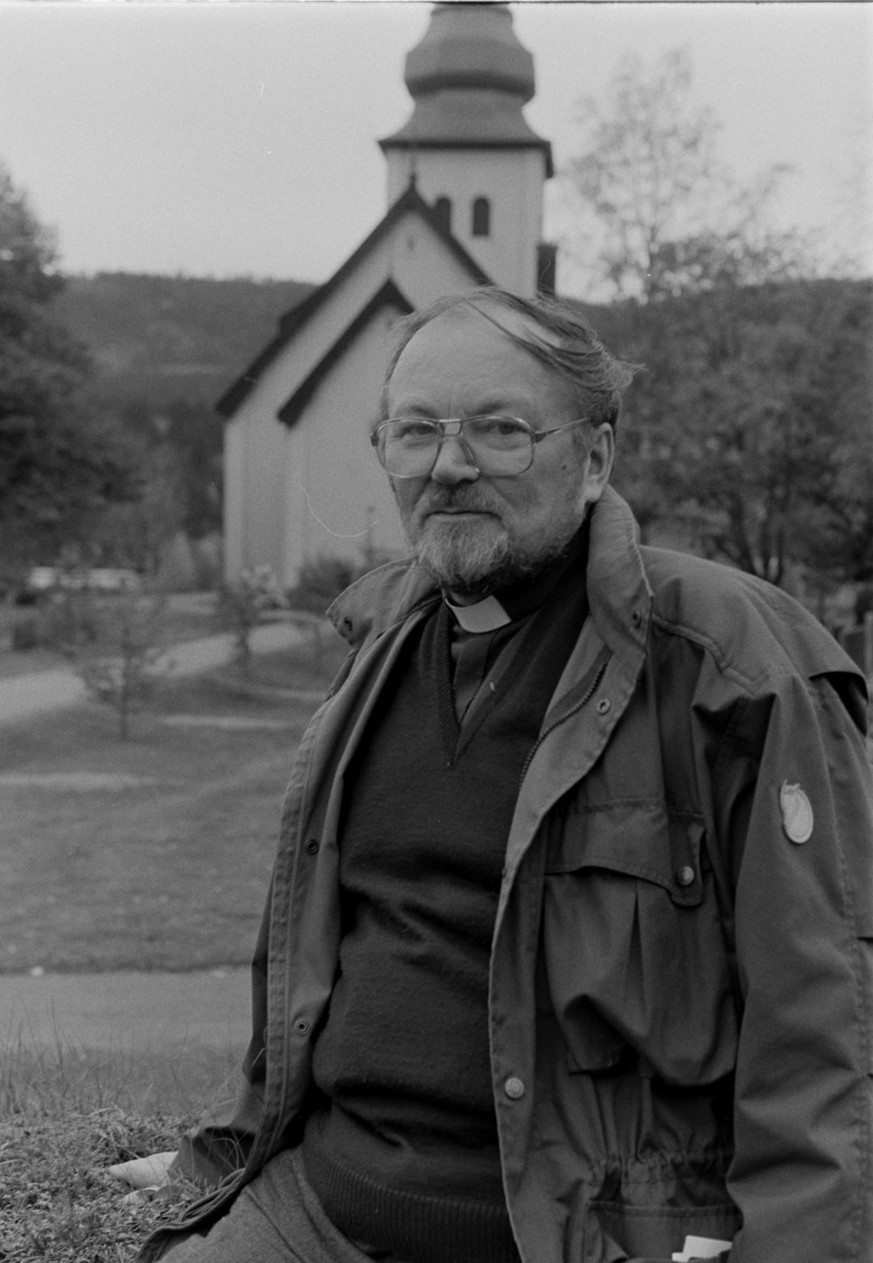 Nils Thomas Pejok, präst, står med ena benet kanske på en bänk med handen på knät. Vinden har blåst hans hår över pannan. Bakom honom syns Dalby stenkyrka.