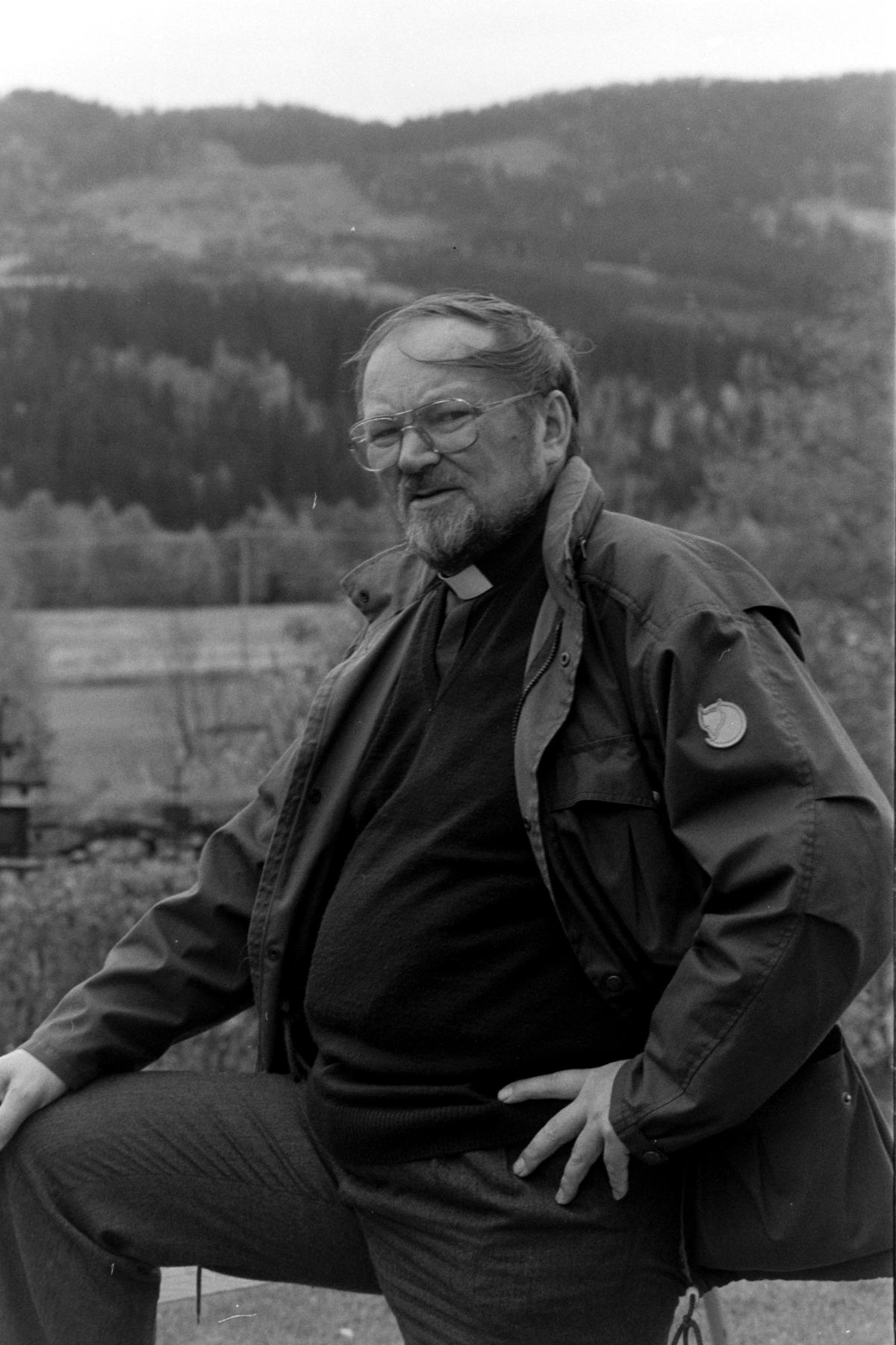 Nils Thomas Pejok, präst, står med ena benet kanske på en bänk med handen på knät. Vinden har blåst hans hår över pannan. Bokom honom syns ett berg med kalhyggen.