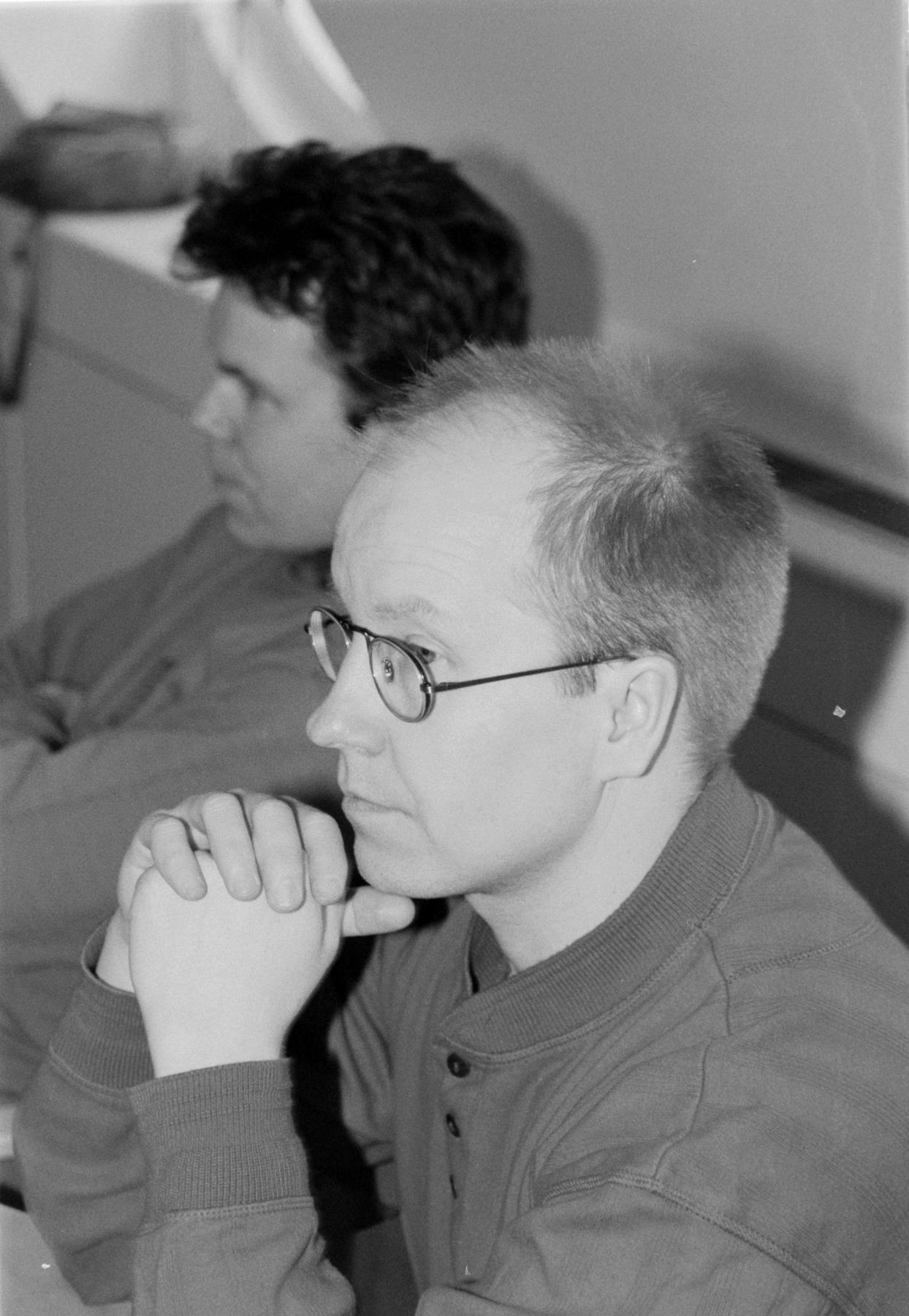 En man sitter djupt i tankar medan han deltar i en slöjdkonferens. Vid hans sida sitter en annan man, lika koncentrerad. Samefolket nr 3, 1992.