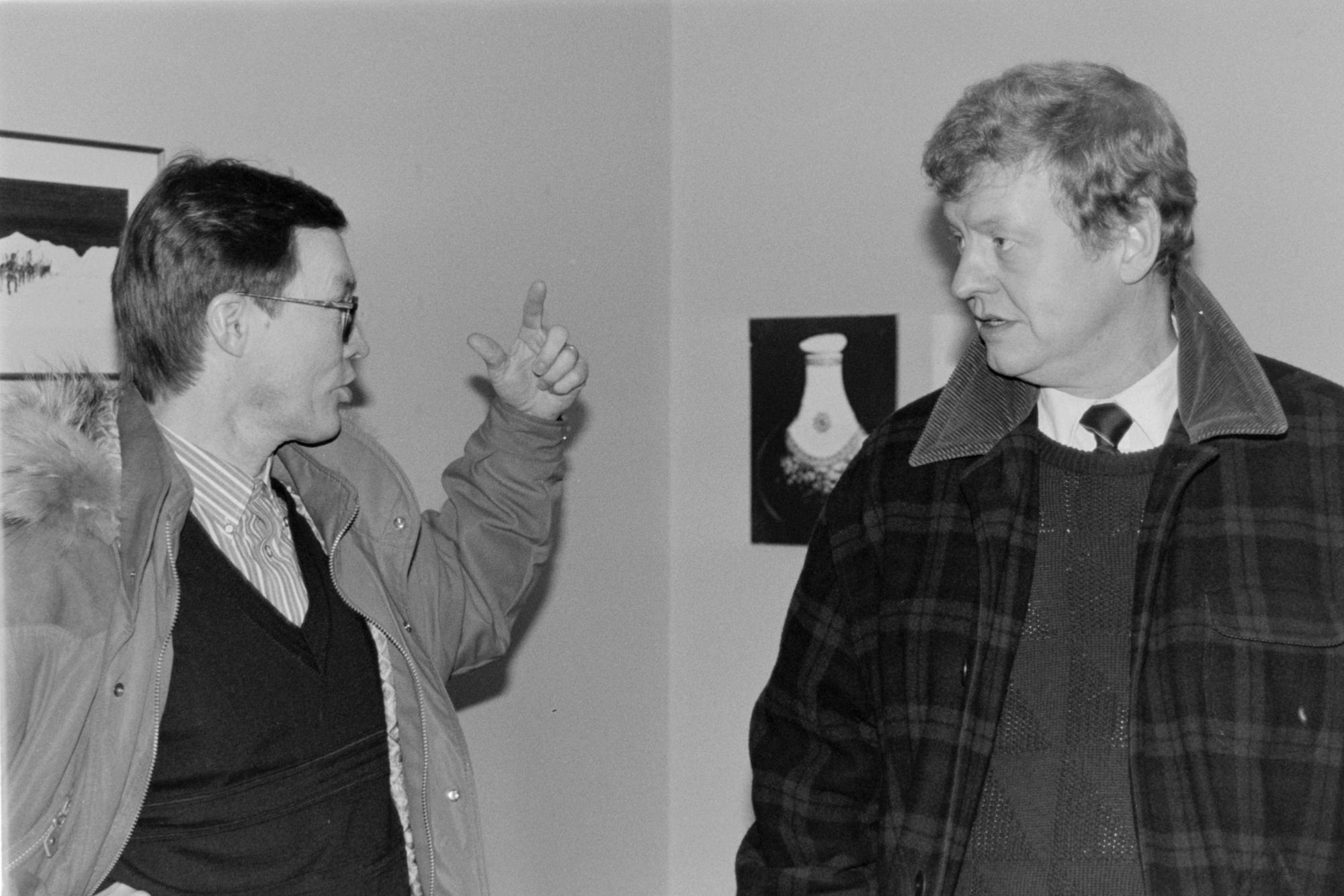- Två män står och pratar nära ett hörn, med flera tavlor med samiska motiv upphängda på väggarna. Mannen till vänster gestikulerar med sin vänstra hand medan han pratar. Båda männen är klädda i flera lager tröjor och en jacka.