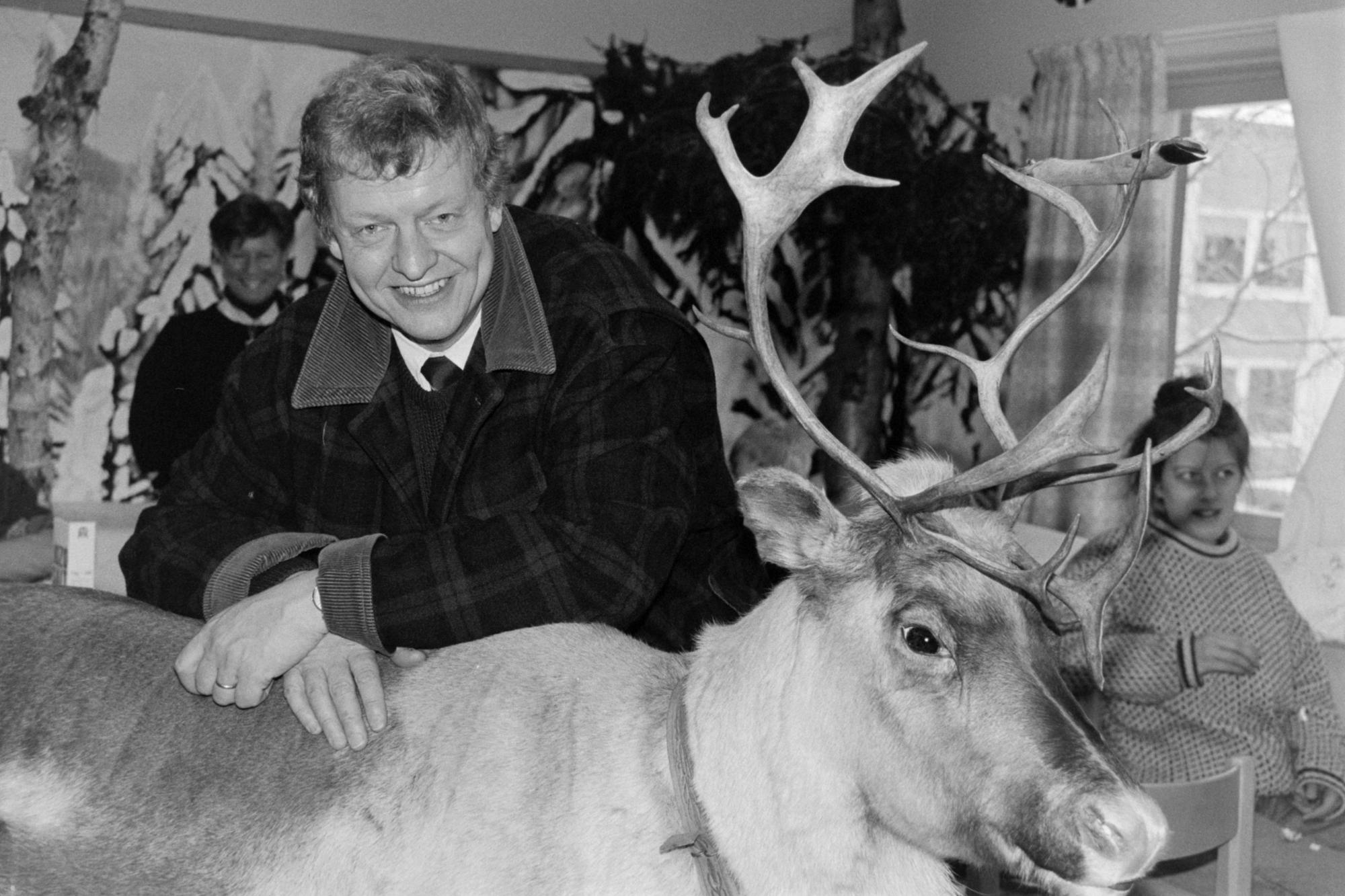 - En leende man lutar sig mot en uppstoppad ren inomhus. I renens horn ligger ett avlångt föremål. Bakom honom står två kvinnor; den ena ler medan den andra tittar bortom kameran. Rummet de befinner sig i är dekorerat med björkar, och en av väggarna är målad som en barrskog i vinterlandskap.