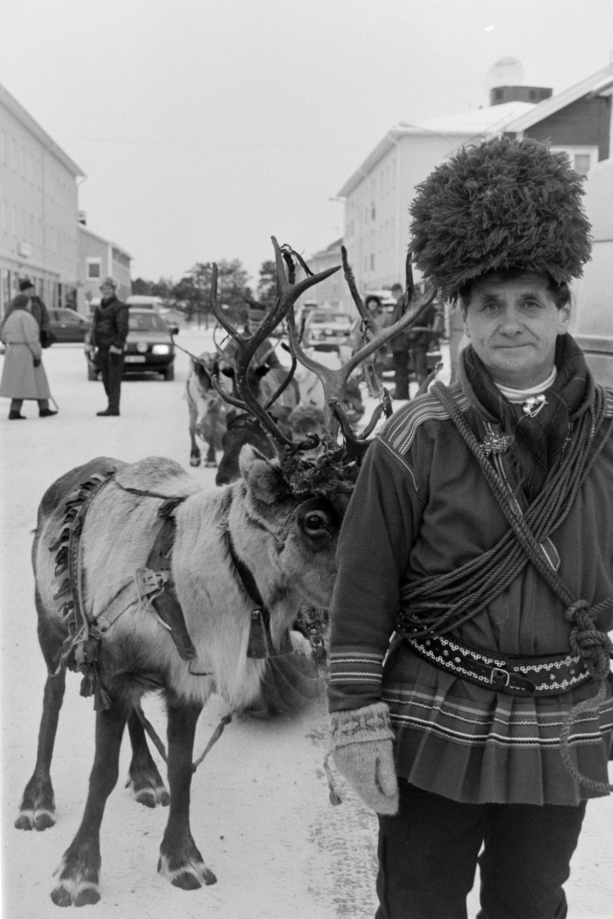 En man klädd i Karesuando-kolt leder renrajden runt marknadsområdet, en tradition som familjen Kuhmunen har upprätthållit i många år. Mannen bär ett lasso runt överkroppen, och den första renen i rajden har även lastknytt fäst runt hans kropp.