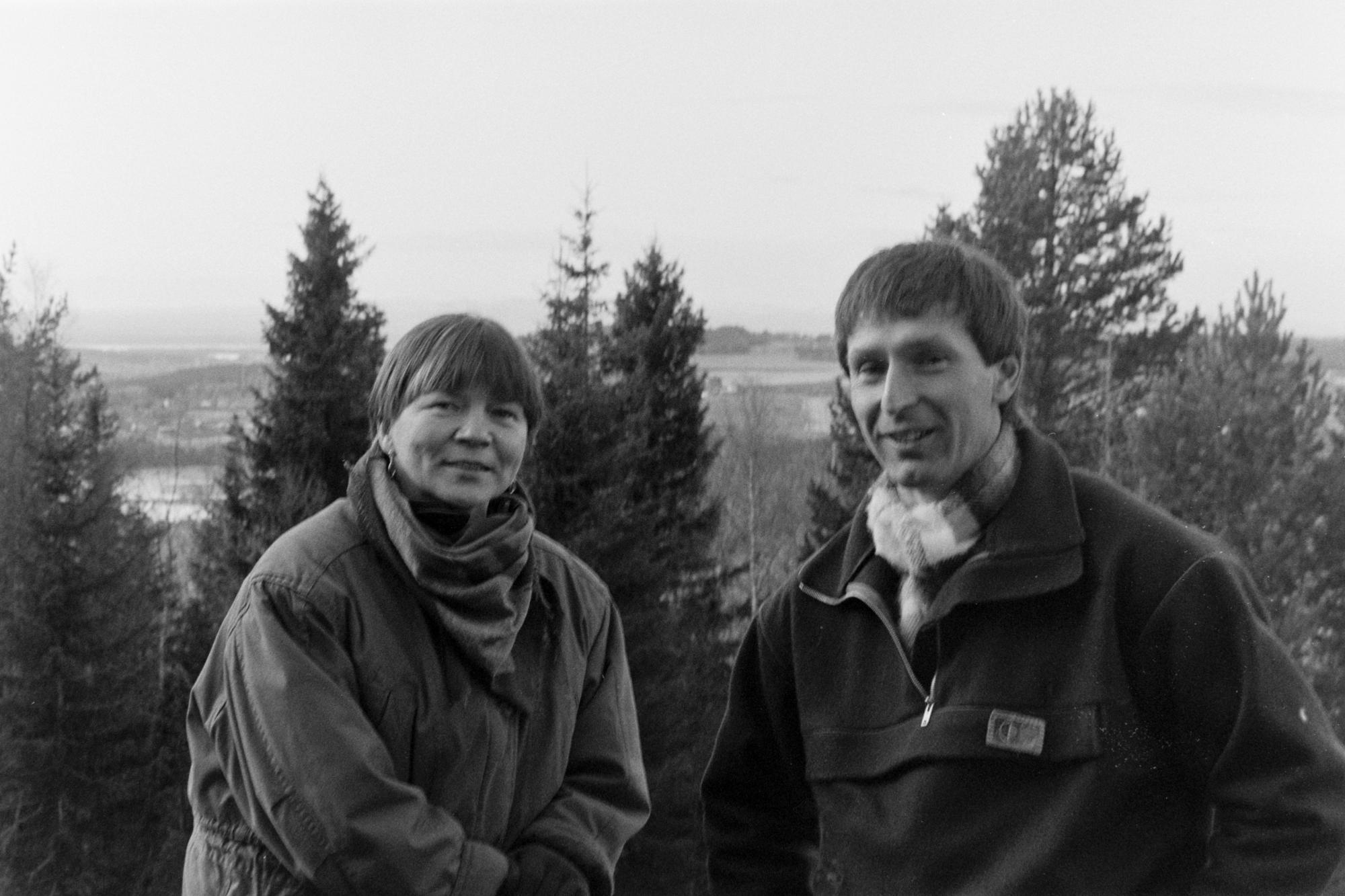 - En kvinna och en man ler mot kameran medan de står på en kulle eller någon annan höjd. De båda har halsdukar och andra tjocakre kläder. Bakom dem syns trädtoppens siluetter, vilket antyder att de befinner sig ovanför skogen, med en vidsträckt utsikt över landskapet.
