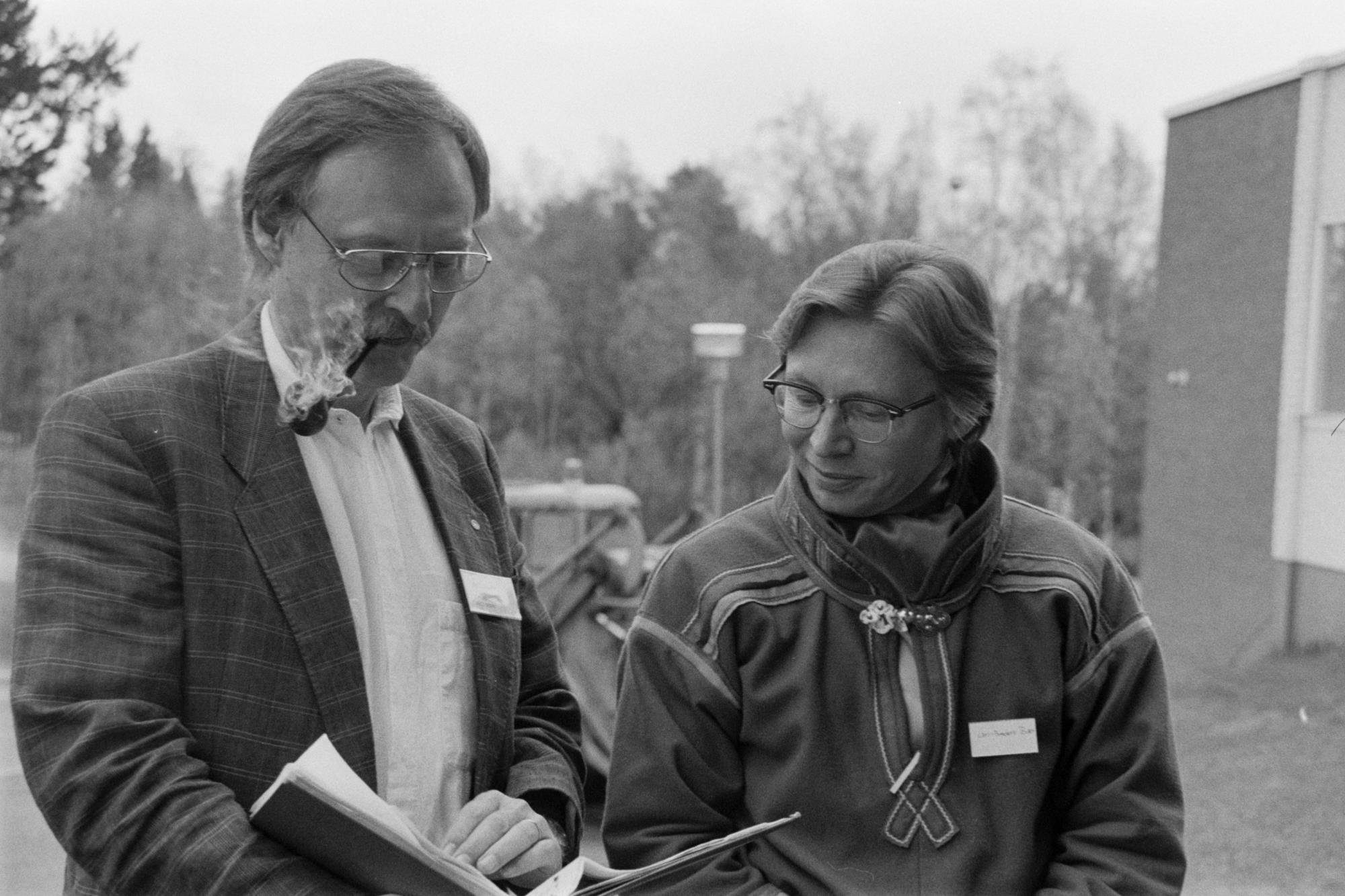 - Två män står bredvid varandra, där den ena till vänster är klädd i kavaj och den andra bär Kautokeino-kolt. Mannen i kavaj röker pipa och håller i en bok som de båda tittar på tillsammans. De deltar i Svenska Samernas Riksförbunds (SSR) landsmöte.