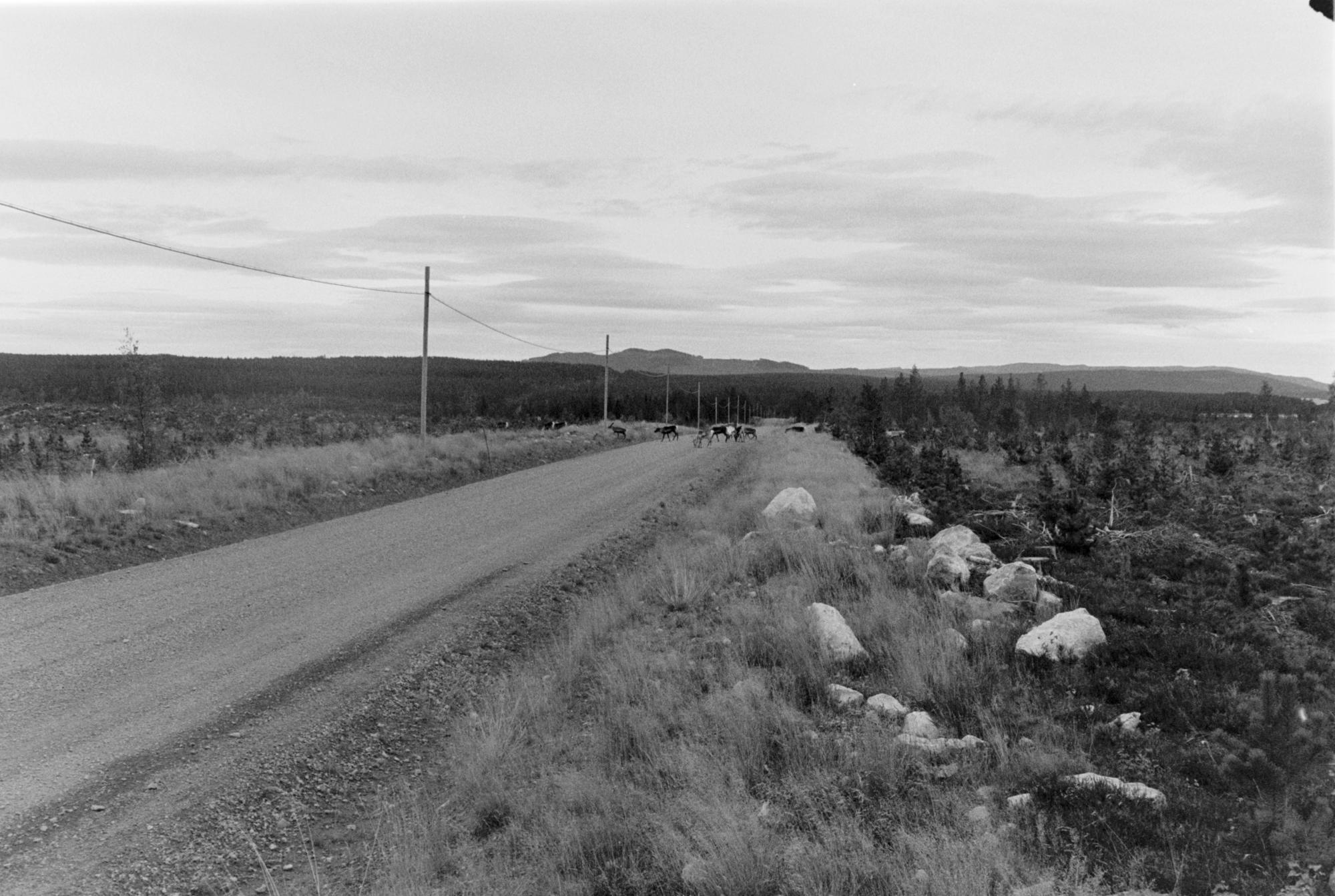 En grusväg sträcker sig genom ett hygge och leder mot en skog. En hjord renar korsar vägen, medan elstolpar med elkablar står uppställda på vänster sida om vägen.
