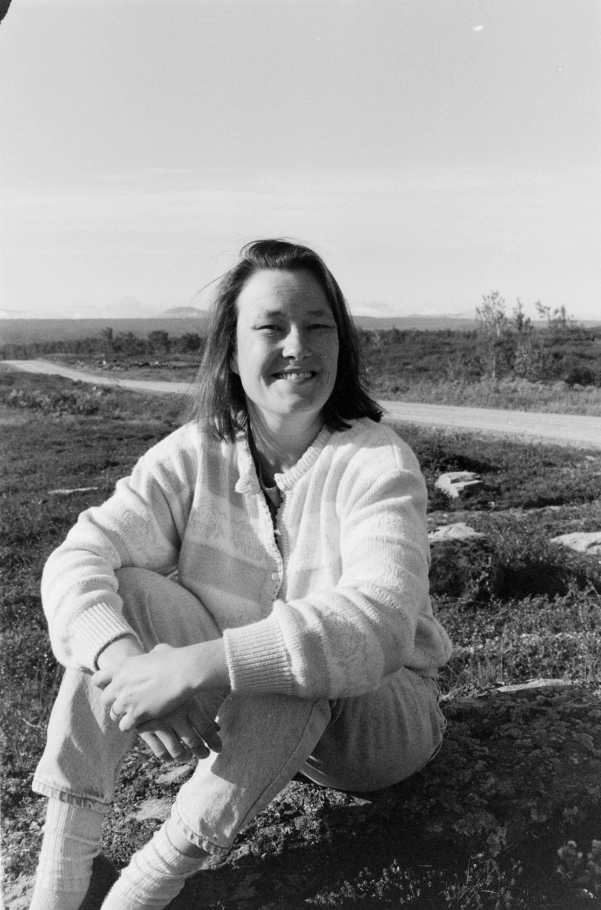 En kvinna sitter på marken intill en grusväg och ler mot kameran. I bakgrunden synns fjällbjörkar och fjäll i horisonten.