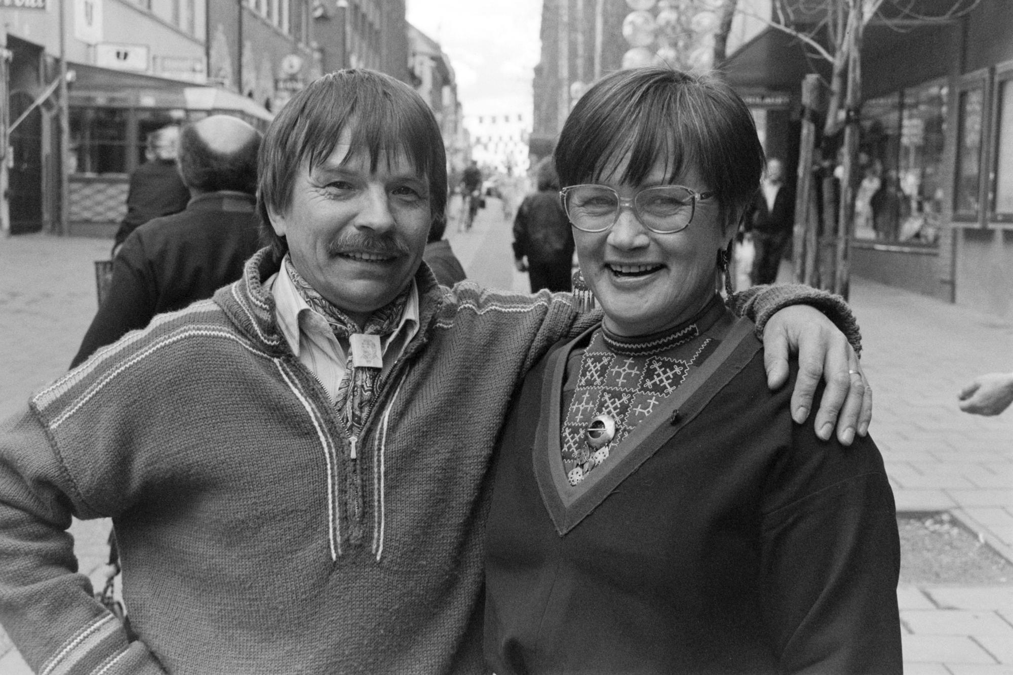 - En man och en kvinna går på en trafikerad gågata. Mannen är klädd i en stickad tröja som påminner om en Karesuando-kolt, medan kvinnan bär en sydsamisk kolt, möjligen från Jämtland eller Härjedalen. Mannen har sin arm runt kvinnans axlar och bär en halsduksring. Kvinnan är smyckad med en silverbrosch och örhängen.