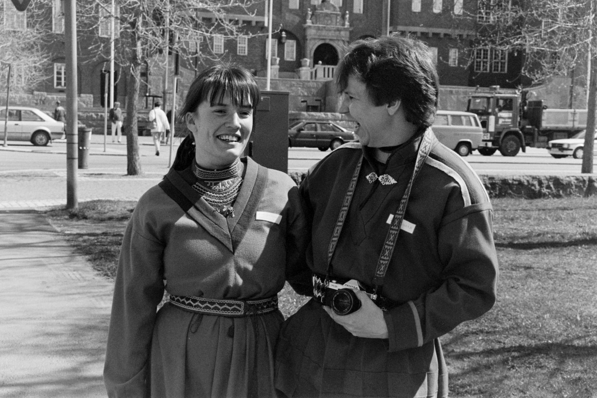 - En kvinna i sydsamisk kolt från Jämtland står tillsammans med en man i kolt som har en kamera runt halsen. Kamerabandet är dekorerat med ett samiskt mönster. Båda bär namnskyltar, men texten på dem är svår att urskilja på grund av det starka ljuset.
