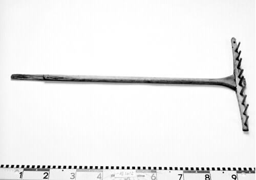 Räfsa av trä med ett skaft som tappats samman med räfshuvudet. Räfshuvudet är rakt och har skurna dekorationer vid skaftet. Räfsan har ursprungligen tio snidade pinnar varav en saknas.
