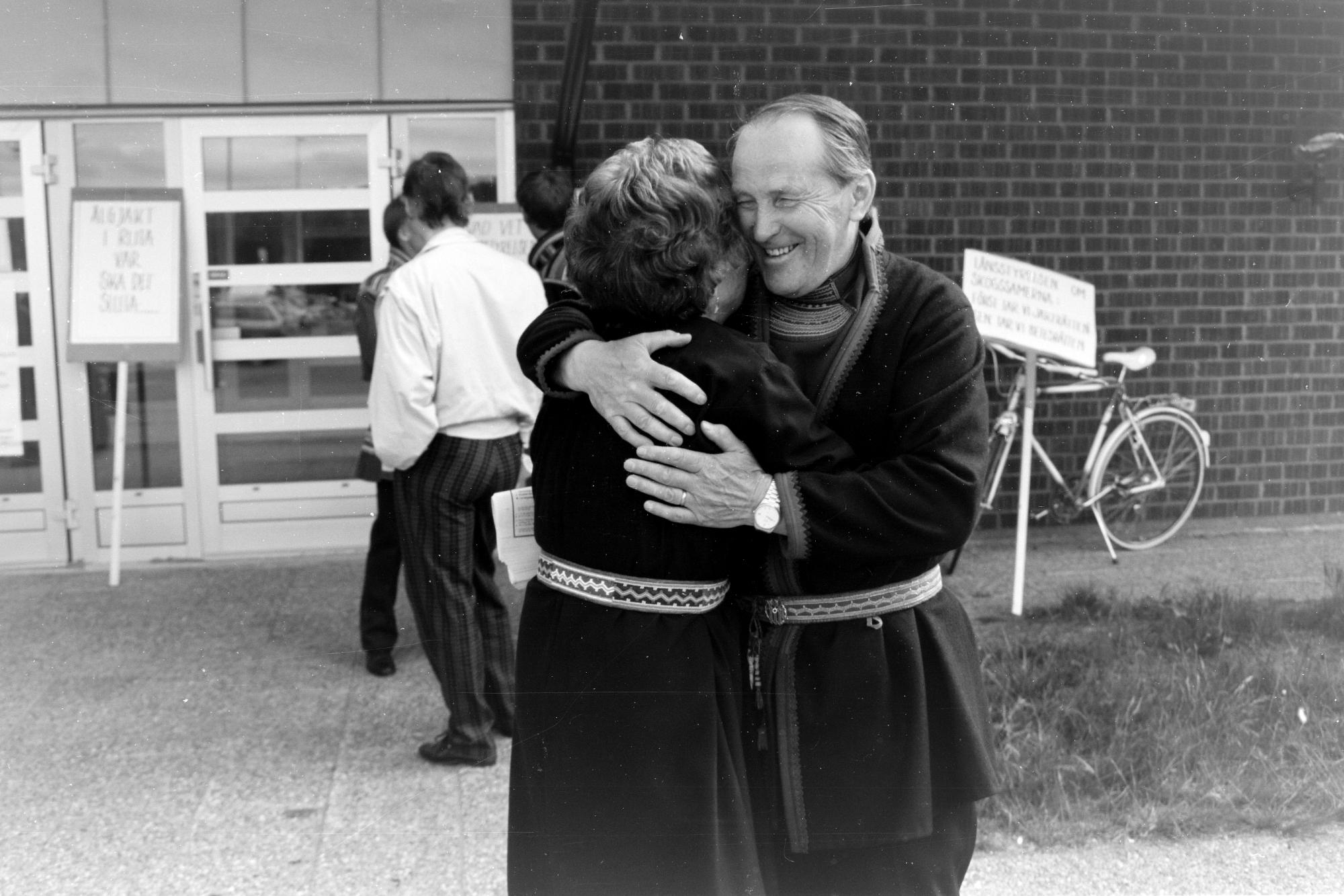 Kvinna och man klädda i sydsamiska koltar kramas på SSR:s landsmöte i Arjeplog. Samefolket nr. 6/7 1990.