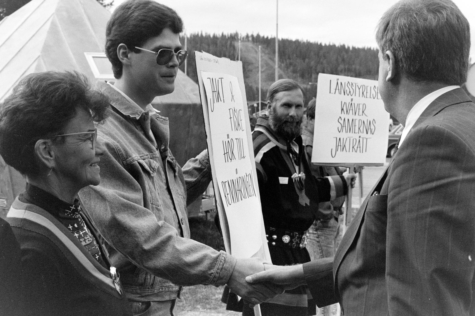 Jordbruksminister Mats Hellström möter demonstranter på SSR:s landsmöte i Árjepluovve/Arjeplog 1990 där det står: Samefolket nr. 6/7 1990.