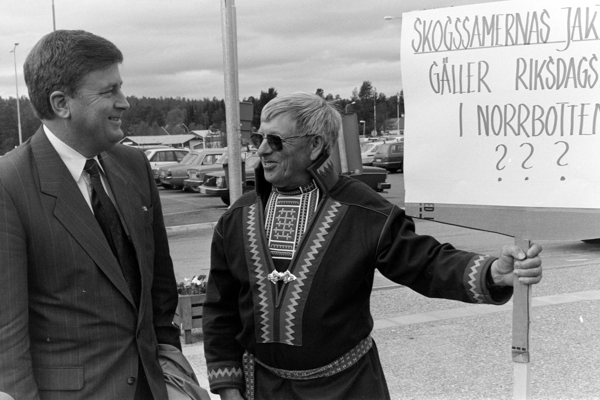 Jordbruksminister Mats Hellström möter Sixten Persson som demonstrerar på SSR:s landsmöte i Árjepluovve/Arjeplog 1990. Samefolket nr. 6/7 1990.