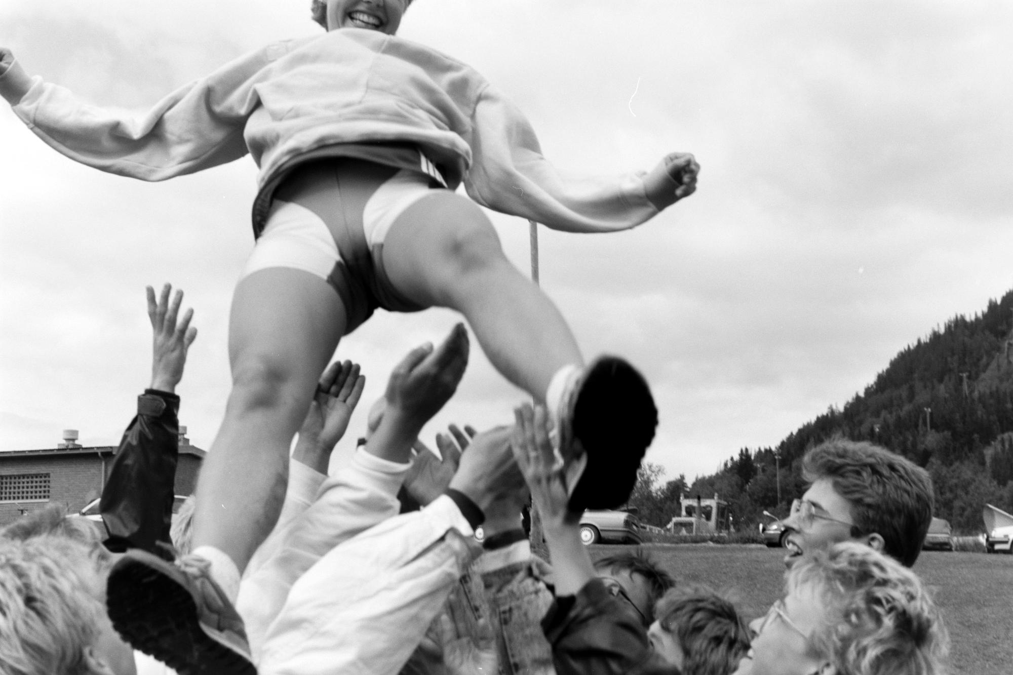Glad kvinna hissas och firas efter att ha vunnit en tävling på Same SM i Funäsdalen. Samefolket nr.9 1989.