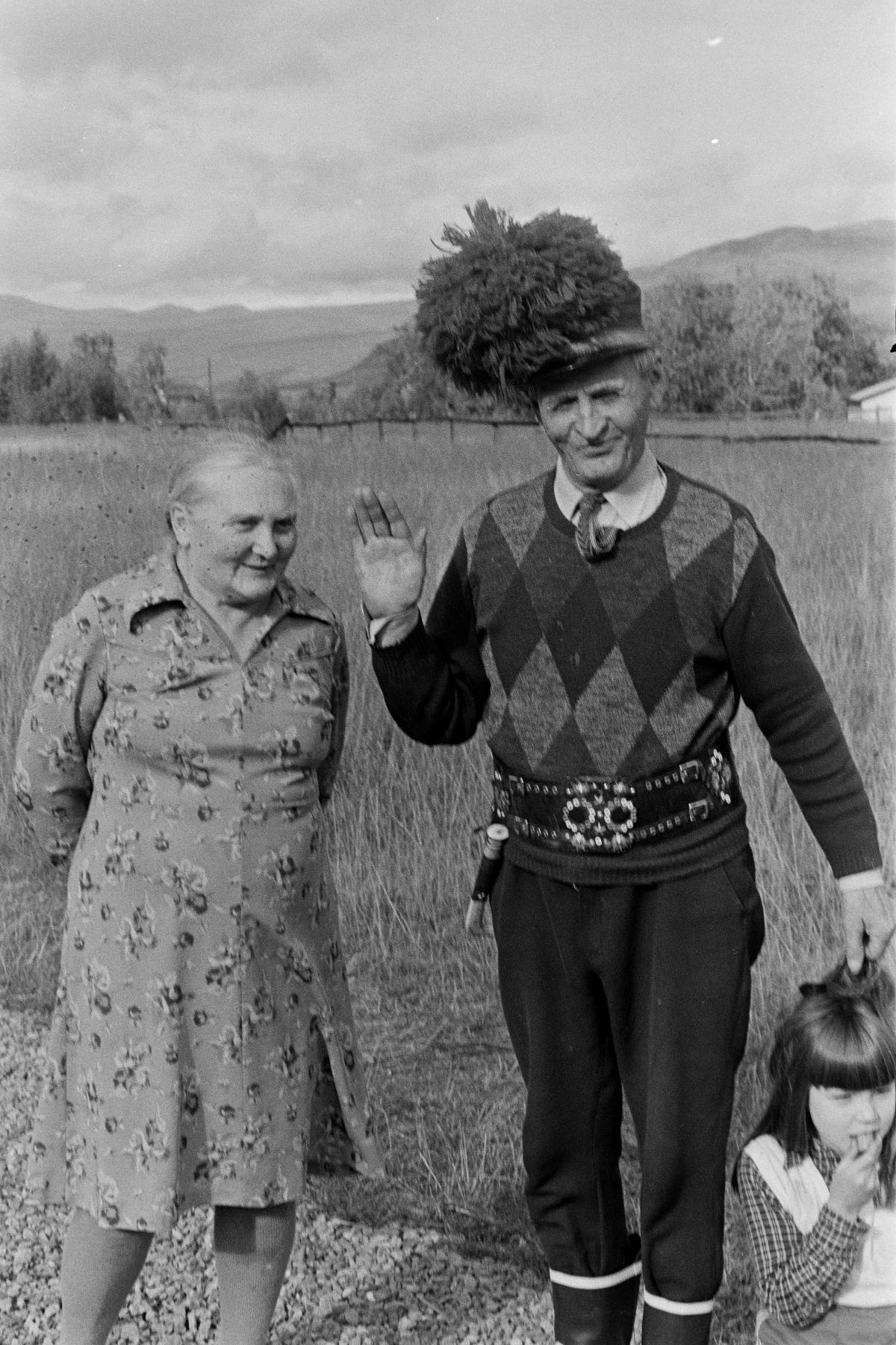 Enok Sarri i tofsmössa och knivbälte tillsammans med äldre kvinna och en flicka.