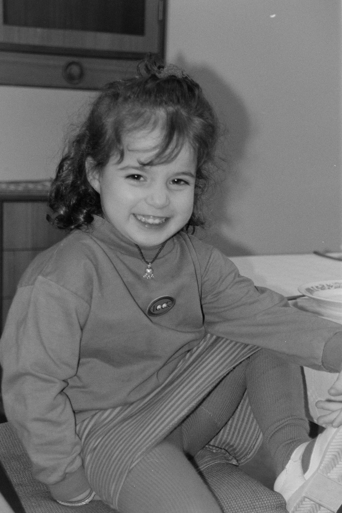 En glad flicka, cirka fyra till sex år, med mörkt lockigt uppsatt hår, ser rakt in i kameran. Hon sitter vid ett dukat bord och bär ett halsband med en liten komsekula och tre ringar på en skinnsnodd runt halsen.