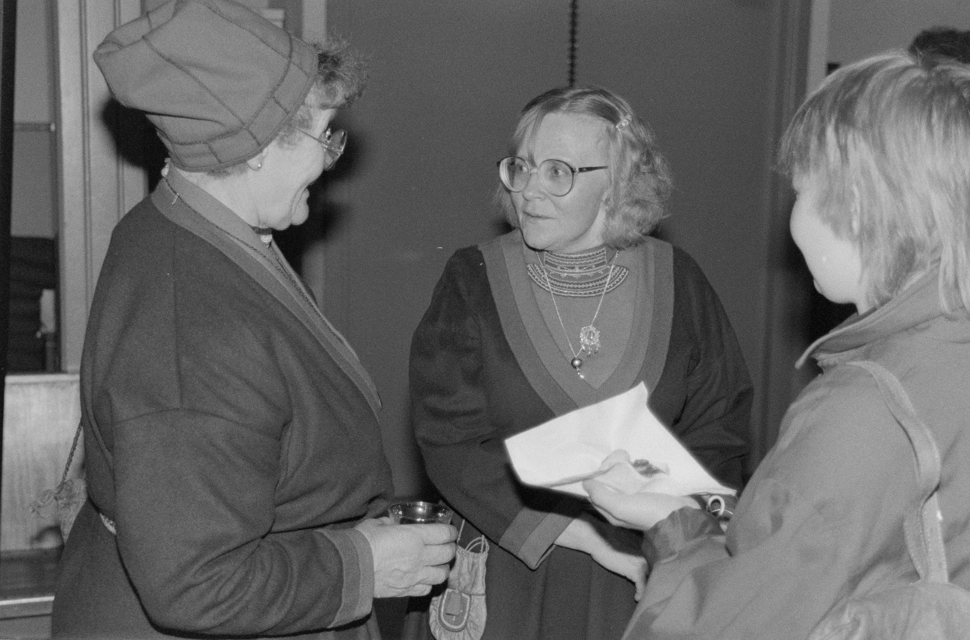 Tre kvinnor står och pratar. Två av dem, som är äldre, bär sydsamiska koltar. Kvinnan i mitten har en komsekula runt halsen och en brosch på barmklädet. De håller i fika.