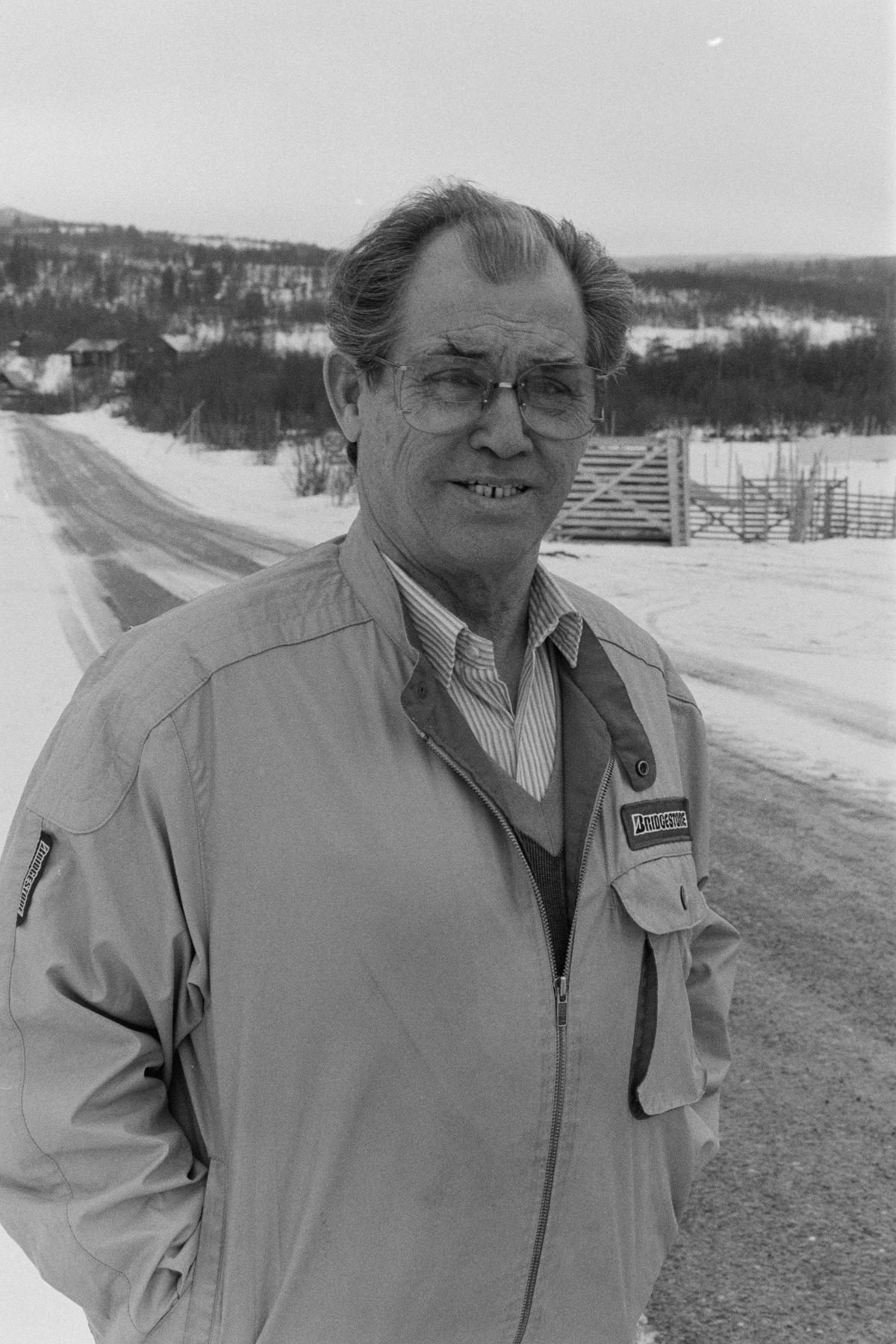 - Närbild på en man ute vid en renhage vid en landsväg. Han har på sig en randig skjorta och en ljus jacka. Han har glasögon och ler. I bakgrunden ett hus vid vägen. Läs mer i Samefolket nr 4, 1991.