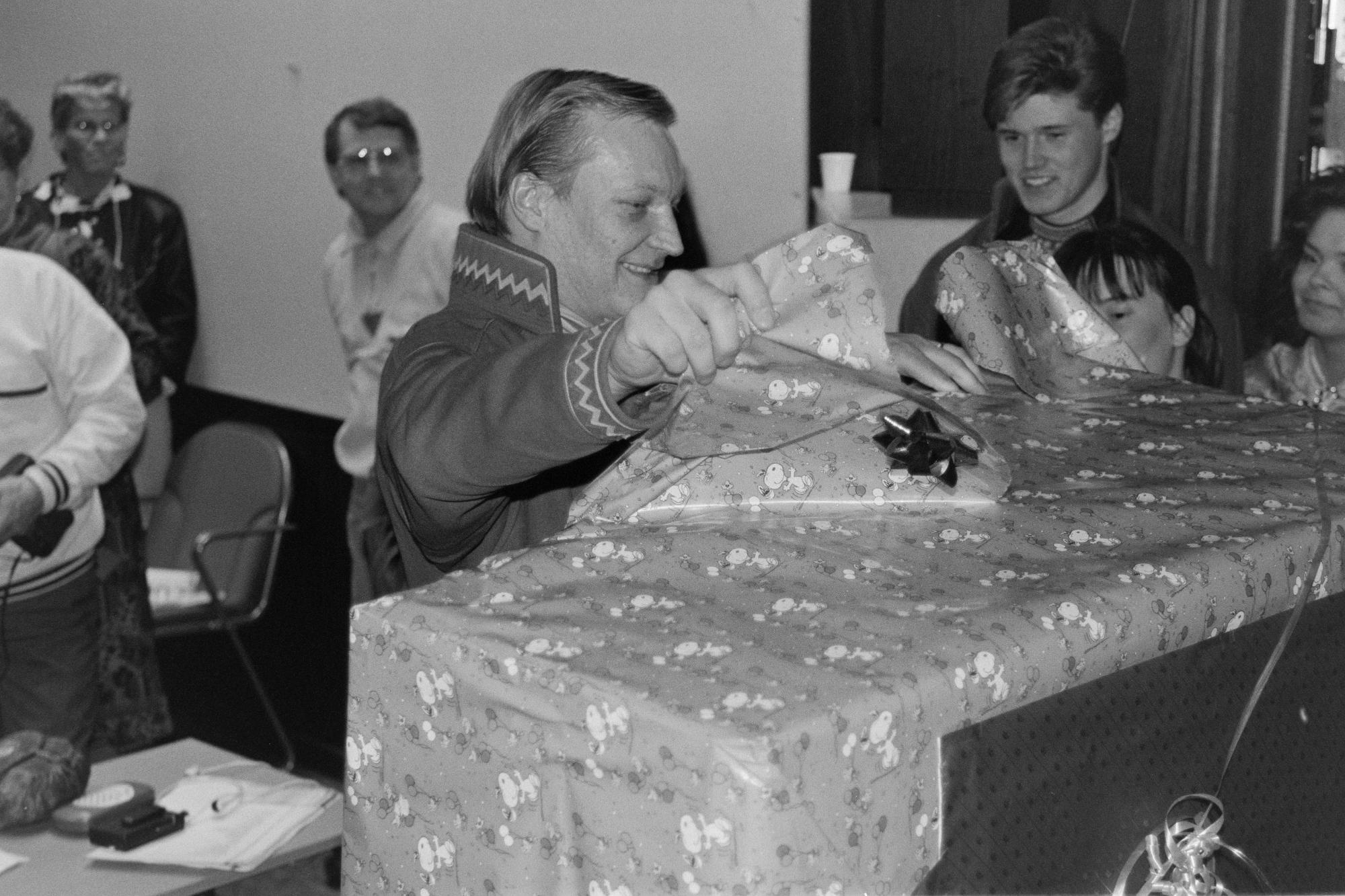 Lars Nila Lasko, i arjeplogskolt, öppnar ett stort paket. Bakom paketet skymtar Britt Sparrok. I bakgrunden är Jörgen Stenberg och Ann-Catrin Blind i kolt. Längre bort mot väggen syns tre personer.