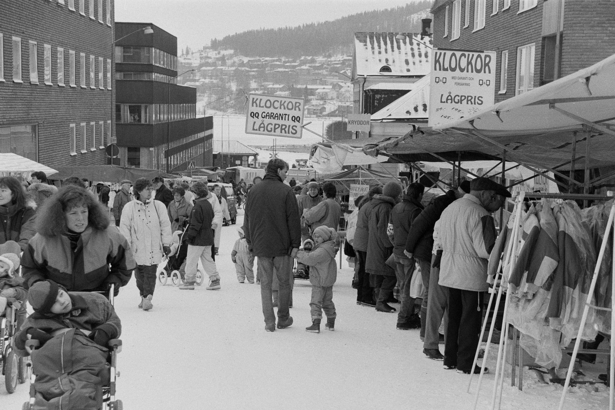 - Ett myllrande marknadsliv bland stånd som är uppradade längs gatusidorna. Stora skyltar med text försöker locka kunder. Föräldrar med barn, både i vagn och gåendes, strosar runt i folkvimlet.