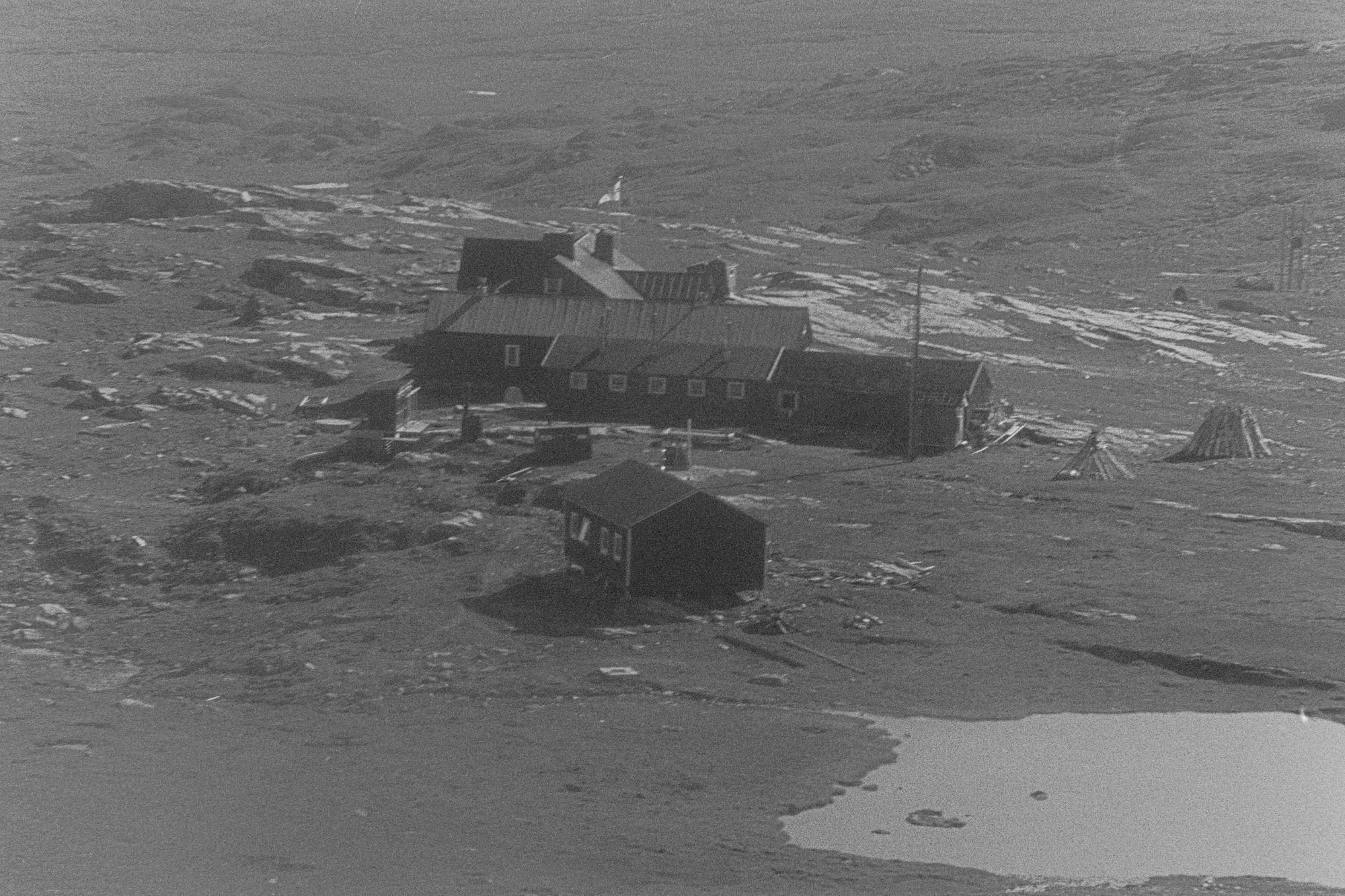 Flera stugor i fjällen. Ett par kåtor utan kåtaduken, bara kåtastängerna är uppställda. En flagga blåser in vinden. En sjö syns i förgunden.