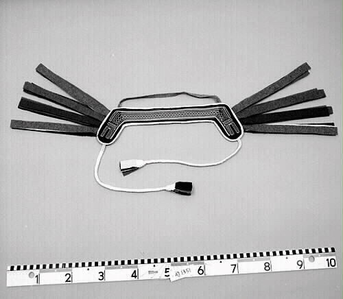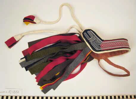 Grimma med tenntrådsbroderi med rund- och plattdragen tenntråd på rött och blått. Kantad med grönt kläde, skodd med vitgarvat skinn, fodrad med barkgarvat skinn som är sydd med sentråd. Mellanlägg, grå vadmal. Vadmals- och klädesfransar. Knytband av sentrådsfläta översydd med vitgarvat skinn, sydd med sytråd, klädestofs med vitt skinn. Hakband av barkgarvat skinn flätat med 8 remsor. Plattdragen tenntråd gjord av Marianne Nilsson, Ammarnäs.