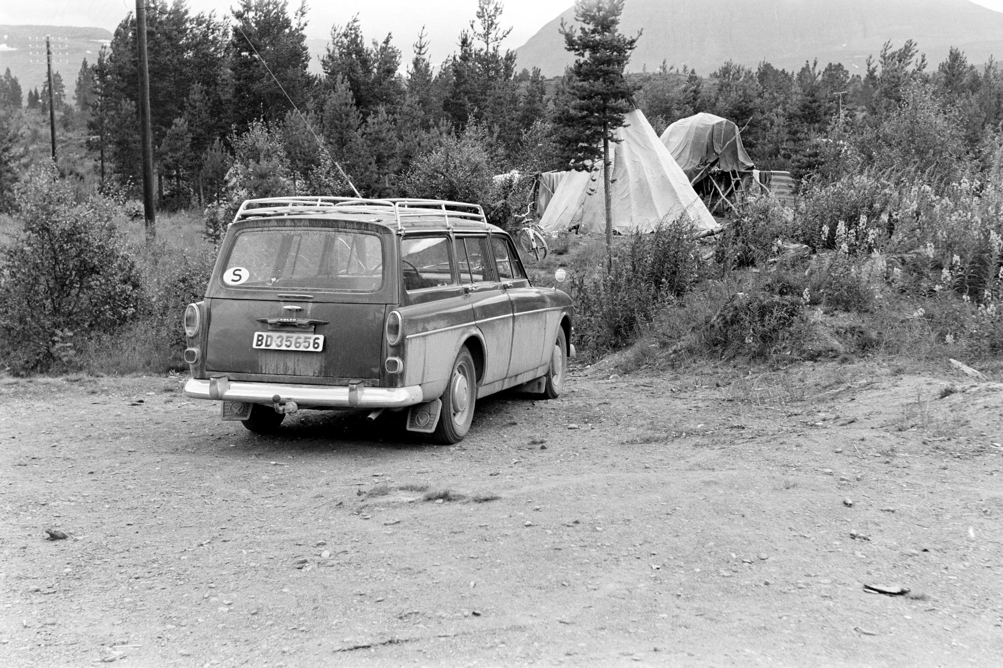 Bil och tältkåta i fjällnära skog. Bilen har BD i sitt registreringsnummer vilket betyder Norrbotten. Troligen Israel Ruongs bil.