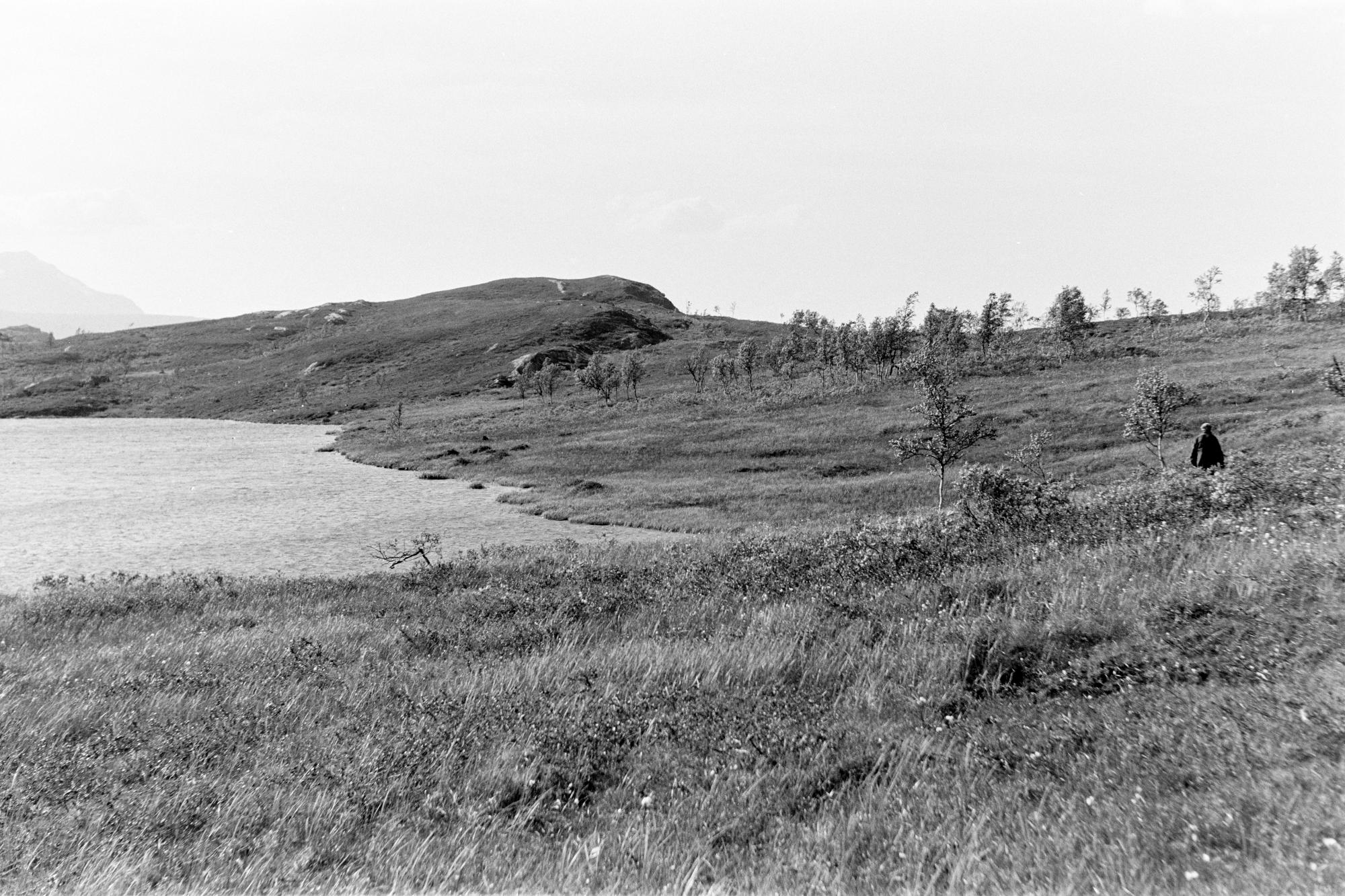 Man vandrar i dvärgbjörk vid fjällsjö med spridda björkar i bakgrunden.