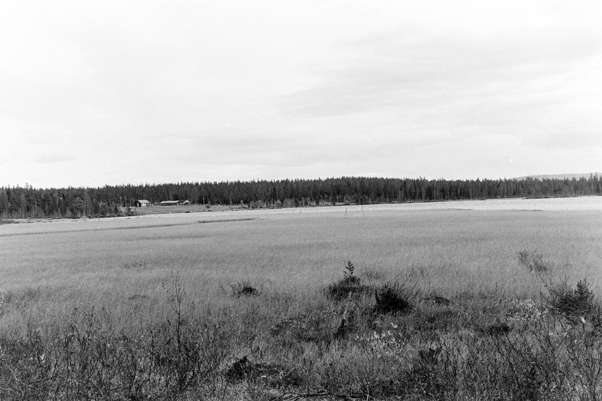 Myr med norrlandsstarr och stående hässjestolpar. I bakgrunden ett mindre småbruk i skogen med gräsvall.