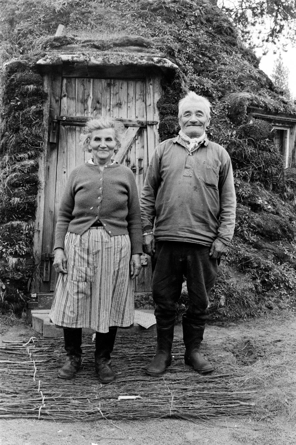 Ett äldre par poserar nöjda utanför dörren till en torvkåta.
