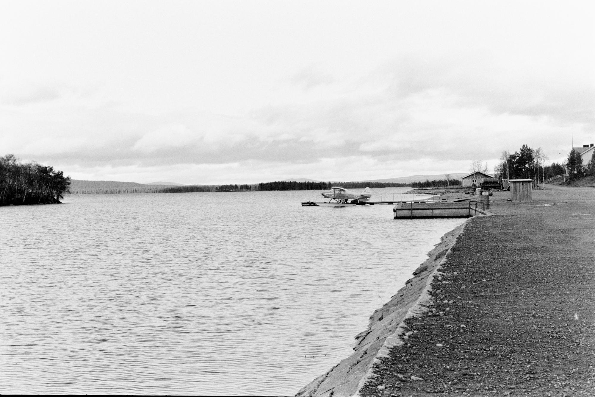 Sjöflygplan vid hamn vid Tjieggelvas med betongelement som strandskoning.