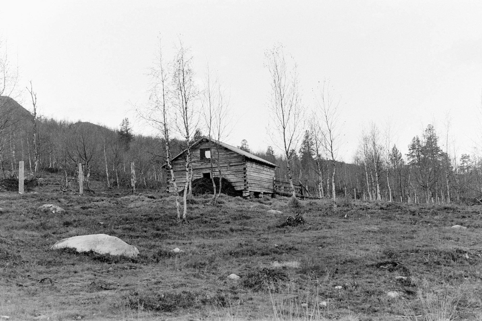 Timrad stuga vid byn Gibdno, med högstubbar, en betesvall, björkskog och en fjällsluttning med björkskog.