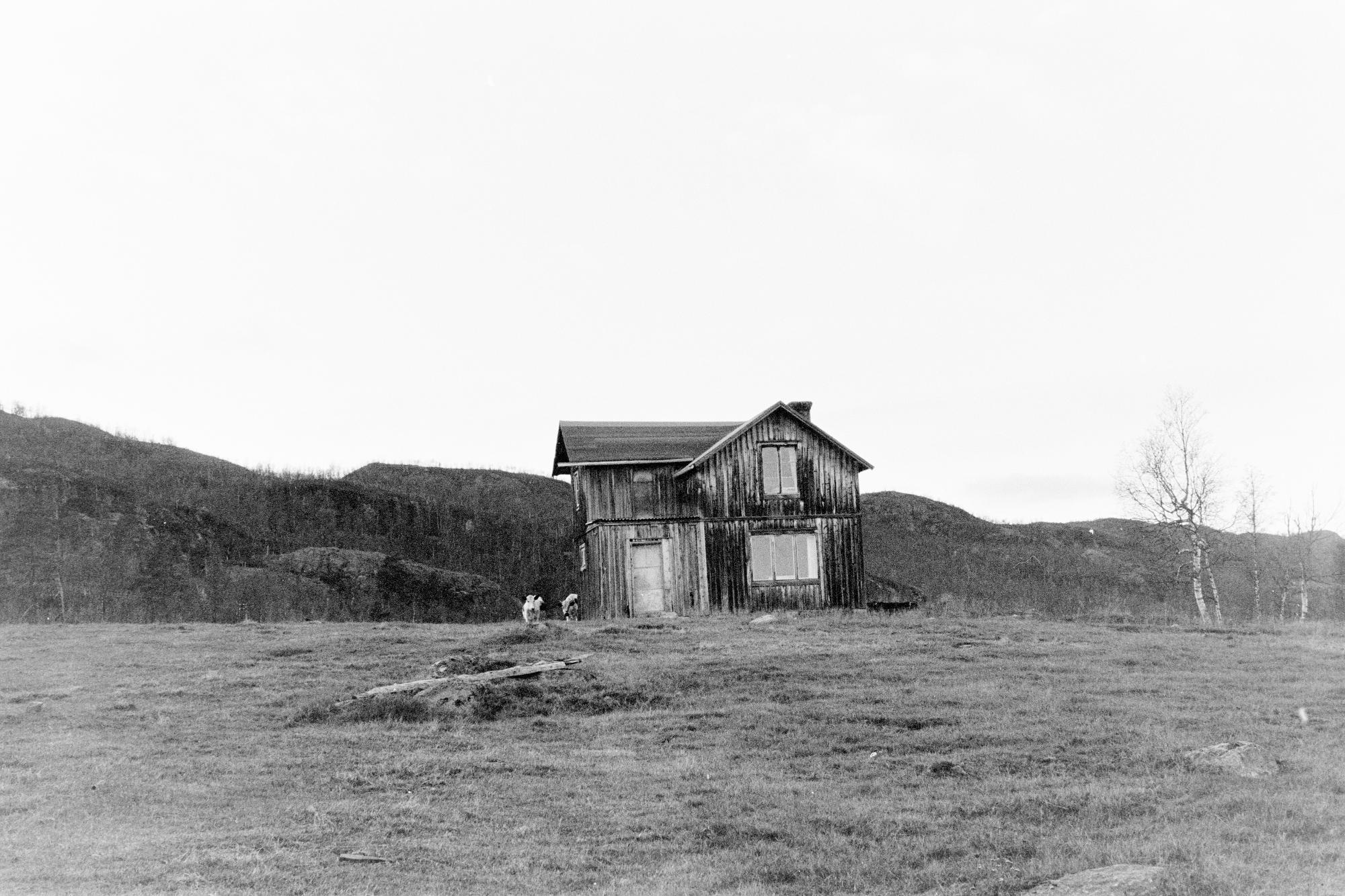 Bostadshus med två fjällkor och slåtter- och betesvall omgivet av lågfjäll, tjärro (saL), och björkskog.