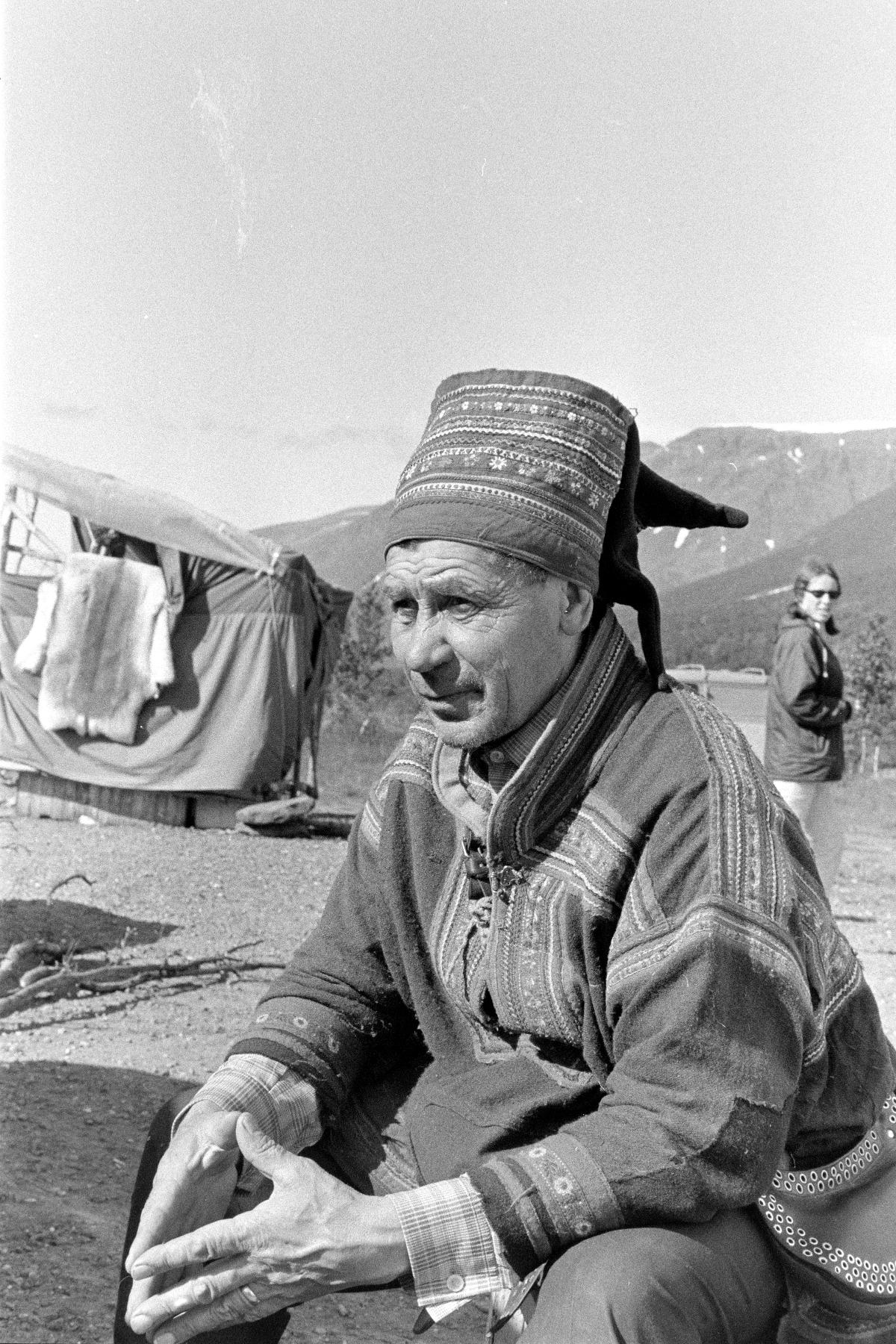 Porträtt av man klädd i en kolt och koltmössa från Guovdageaidnu. I bakgrunden syns en renhud som hänger på en lina och en turist. Mannen är en försäljare som säljer produkter från ett stånd vid vägen.