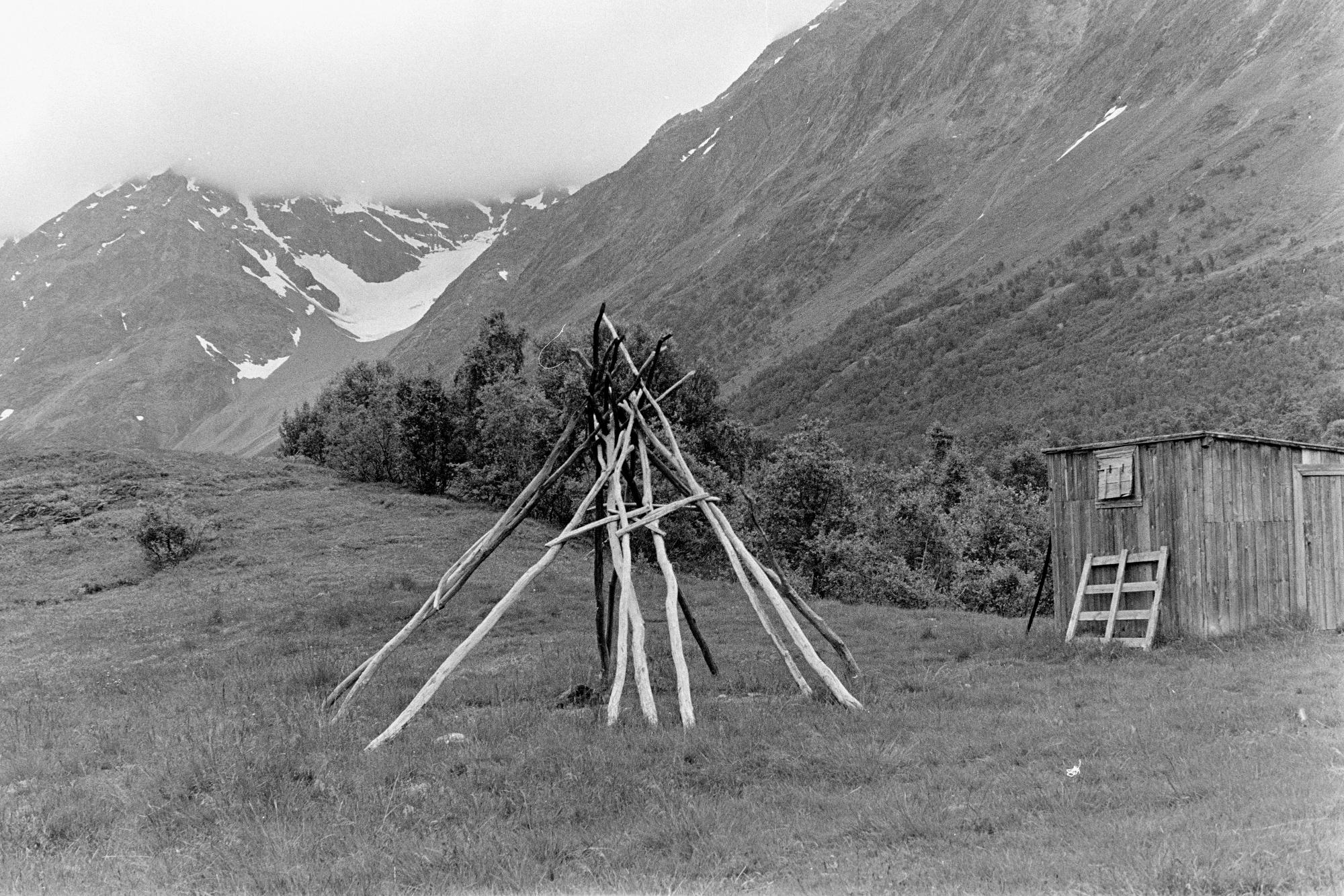 Boplats med upprest tältkåta utan duk och en bod. "Från svenska samers gamla boplats i Lyngseidet", skriver Israel Ruong i sin bildbeskrivning.