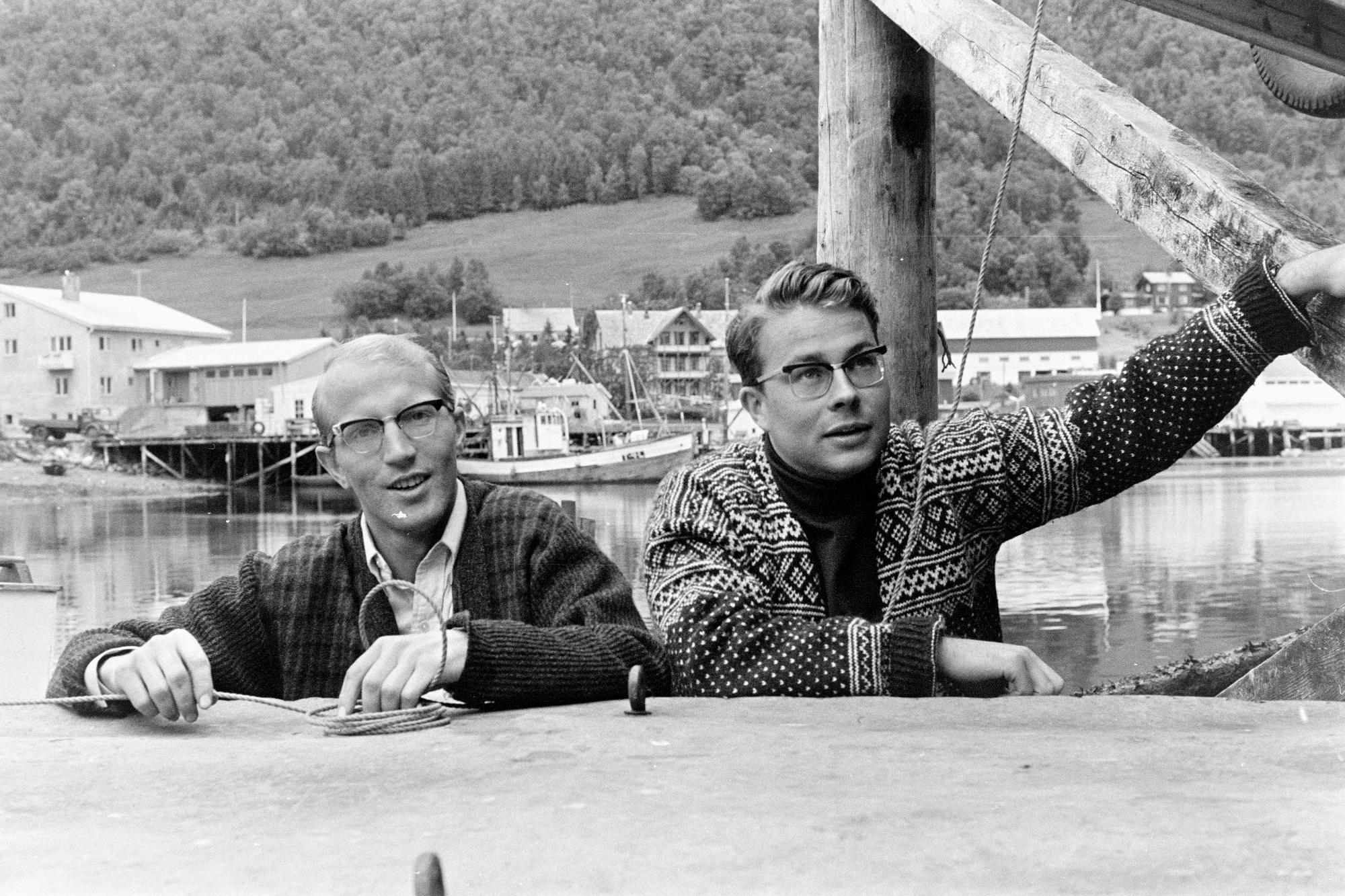 "Från fisket i Lyngseidet 21/7", skriver Israel Ruong i sin bildbeskrivning. Två män i hamnen. den ena samlar upp en förmodad vajer.