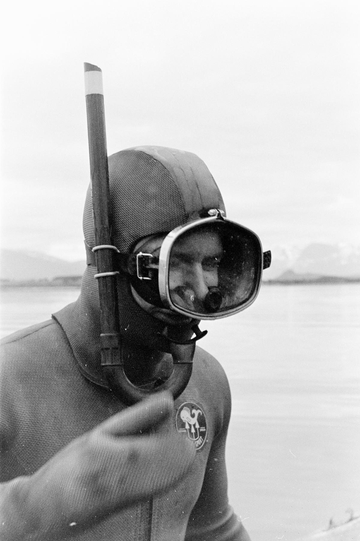 En dykare gör sig redo för att dyka i havet. "Från fisket i Lyngseidet 21/7", som Israel Ruong har antecknat i sin bildbeskrivning.