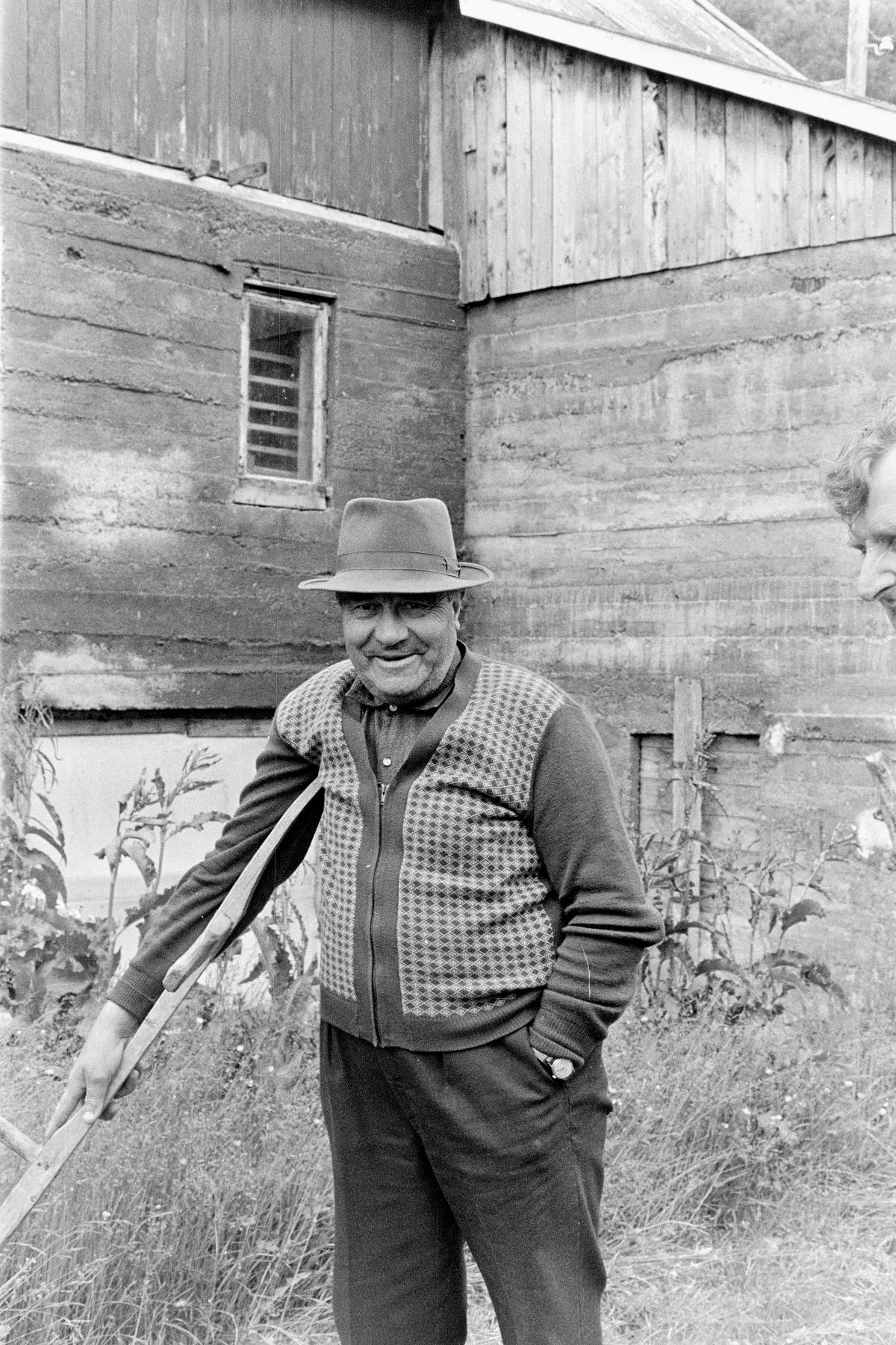 "Man som kallas sig ""hokkmer"" lutar sig på en käpp. Han har en hatt på huvudet. Israel Ruong antecknade: ""Den 22 juli skjutsade sokneprest Asbjörn Klokkman oss till Lyngseidet-Olderdal-Birtavarre, Kåfjorddalen, Mandalen och åter för att göra oss bekanta med kommande meddelare. Flokkman har ett stort prestegeld men känner det oaktat sina forsamlingsbor väl. Vi var mycket välkomna vart vi kom. På följande söndag skulle kyrkhelg hållas i Birtavarre och den därpå följande (den 4 aug) en stor samisk helg i Lyngseidet. Det är uppenbart att Flokkmans aktivitet ifråga om kyrkhelger på samiska och annars betyder mycket för samhörighetskänslan samerna emellan de olika bygderna, jfr intervjun med Flokkman pả band 25, se längre fram. Bygden Olderdalen-Birtavarre-Kåfjorddalen-Skarvdalen-Mandalen tillhör det mest samiska i hela Lyngenområdet. I varje gård förstår man och talar lapska. Men den yngsta generationen har förlorat sitt samiska modersmål, ett resultat av skolan. De flesta ansåg att det är bra att ungdomen behärskar norskan. En del av de äldre var dock nedslagna av att samiskan håller pả att försvinna. I Birtavarre stannade vi hos Malene Pedersen Nyvoll (88 ar) och hennes ogifta barn i 50 års åldern. De berättade om evakueringen då tyskarna brände bygderna i Finn- marken och nordligaste Troms fylke. Nyvolls hade varit evakuerade till trakten av Hamar i Syd-Norge. De mörka nätterna i juni hade gjort ett starkt intryck på dom. Övre Kåfjorddalen är ganska vid och plan (jfr foto 5:33-34) och bördig. Gårdsbruket är huvudnäring. Mjölk levereras till mejeri i Nordreisa. Man har mycket får. Ullen spelar fortfarande en stor roll som råvara för vävning av ranor och stickning av sockor och vantar. Ett ullkarderi finns, som drivs av bröderna Lövli (jfr foto nr 5:35-36-37 och 6:21-22 samt intervjun med Hjalmar Lövli (band 8). Vi träffade bl a Mons Gundersen och Ole Elvenes som vi kom att intervjua senare. Frän Kåfjorddalen (Gaivuonvagge) for vi till Skaradalen (Skarvagge), en ganska isolerad bygd på ett tiotal gårdar. Den ligger på en nordsluttning och där är mycket snörikt om vintern. Där är mycket kallt. Det berättades att det hänt att Kåfjorden frusit ända till Mandalen och att man gått över isen till norra stranden av fjorden. Vi kom senare att intervjua leser Hans Joakim Johansen, hans hustru Pauline och Nils Skardal och hans hustru Marietta, Jfr foto nr 7: 25- 36A 1 - 2 samt band 15-17. Hans Joakim Johansen läser ur postillor vid predikosamlingar på söndagarna. Kyrkan och religionen spelar en mycket stor roll för befolkningen omkring Lyngen. Sekulariseringen har på långa vägar ej fortskridit sả långt som i Sverige. Fjällområdet Nordneset, söder om Kåfjorden var bara till för några år sedan ett svenskt renbetesområde, där bl a släkterna Päiviö och Hetti betade sina renar. Nils Hotti nämner i en av sina jojkar Skarvdalen. Kristian Jonsen i Mandalen, se nedan, kände Nils Hotti. Från Skarvdalen körde Flokkman oss till Sammelsberg och Mandalen, där vi bl a besökte Dalvik. Den äldsta i familjen är Anne Lise Dalvik, som vi intervjuade senare, band 11. Se ocksả foto 7:16 A-20A, samt 6:10. Hon är 80 år och är dotter till Erik Jonsen, lastadianpredikant, som betydde mycket för bygdens andliga liv och för den lastadianska rörelsen. Han ägde ett slags apstolisk succession genom att han var lärjunge till Antin Pieti, en av Lars Levi Lestadius första lärjungar. En del av Jonsens predikningar är tryckta. Jag läste en där han polimiserar med en riktning som kallade sig de förstfödda. Det är västlaestadianerna. Senare har jag hört att laestadianerna splittrats i sju olika riktningar. Efter besöket hos Dalviks åkte vi ett stycke upp efter Käringdalen (Akkavagge) och besökte Nils Hansen, Vatne. Senare intervjuade vi honom, band 12:2-13, se också foto 7:21A-23A. Vi körde därefter uppför Mandalen till getsätern, se foto 6:12-20. Därefter gick färden tillbaka till Olderdal och med färjan till Lyngseidet. "