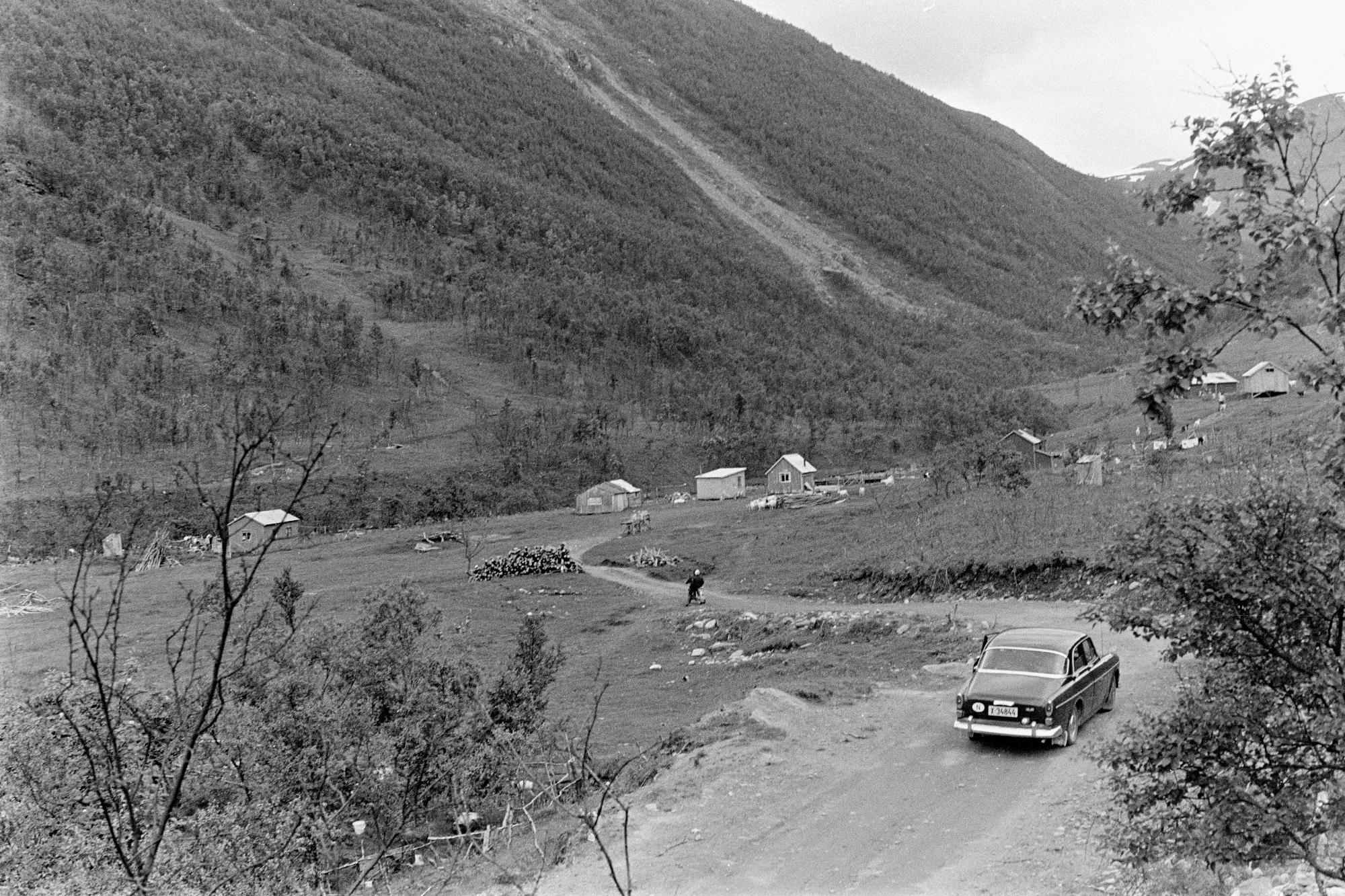 - En bil av märket Volvo Amazon står på en gruvsväg som sträcker sig till en by med mindre hus, vedkastar och uthus. Israel Ruong beskriver bilden: "Från getgården i Mandalen".
