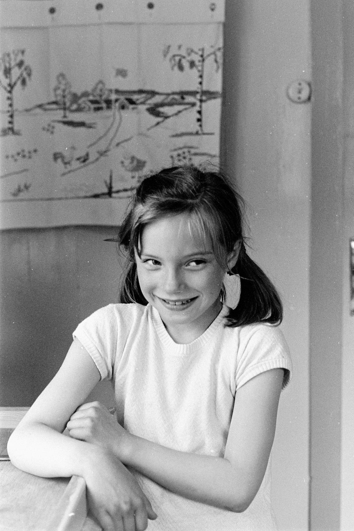 Porträtt på flicka. Ser ut att vara en aning blyg för fotografen.