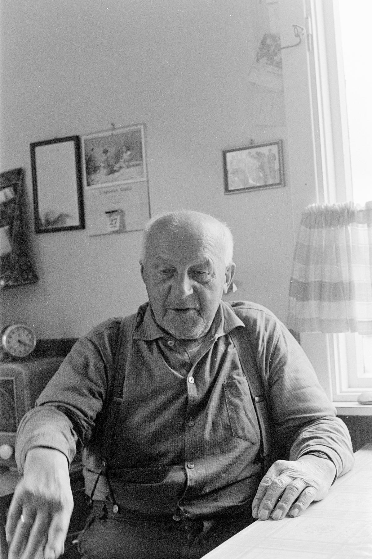"En man intervjuas av paret Ruong och Israel Ruong antecknar: ""Den 27 juli åkte vi taxi till Furuflaten och intervjuade 0le Mikkelsen, band 19:3 och band 20:1. Ole Mikkelsen 81 år träffade vi i handelsboden (ägare Hans Hamnvik bror till Johan Hamnvik) och följde honom hem. Han var meddelsam och vänlig och föraktade dom som inte ville tala lapska. Vi intervjuade också hans dotterdotters man Thormod Enebakken (30 år) band 20:2, jfr bilderna 8:8A-12A. Vi gick sedan till Hans Hamnvik. Han vägrade att intervjua sig. Han utbredde sig över samernas isolering och norskans förträfflighet för att bryta isoleringen. Själv hade han gått i handelsskola i Bergen. Han hänvisade oss till Nils Larsen 83 år som jag intervjuade. Hans åderförkalkade hustru störde intervjun med att tjata om att han hade fallit, band 20:3-21:1. Kort samtal också med hustrun Ellen Birgitta 81 år och från Kvänangen, varit gift i Birtavarre, jfr bild"""