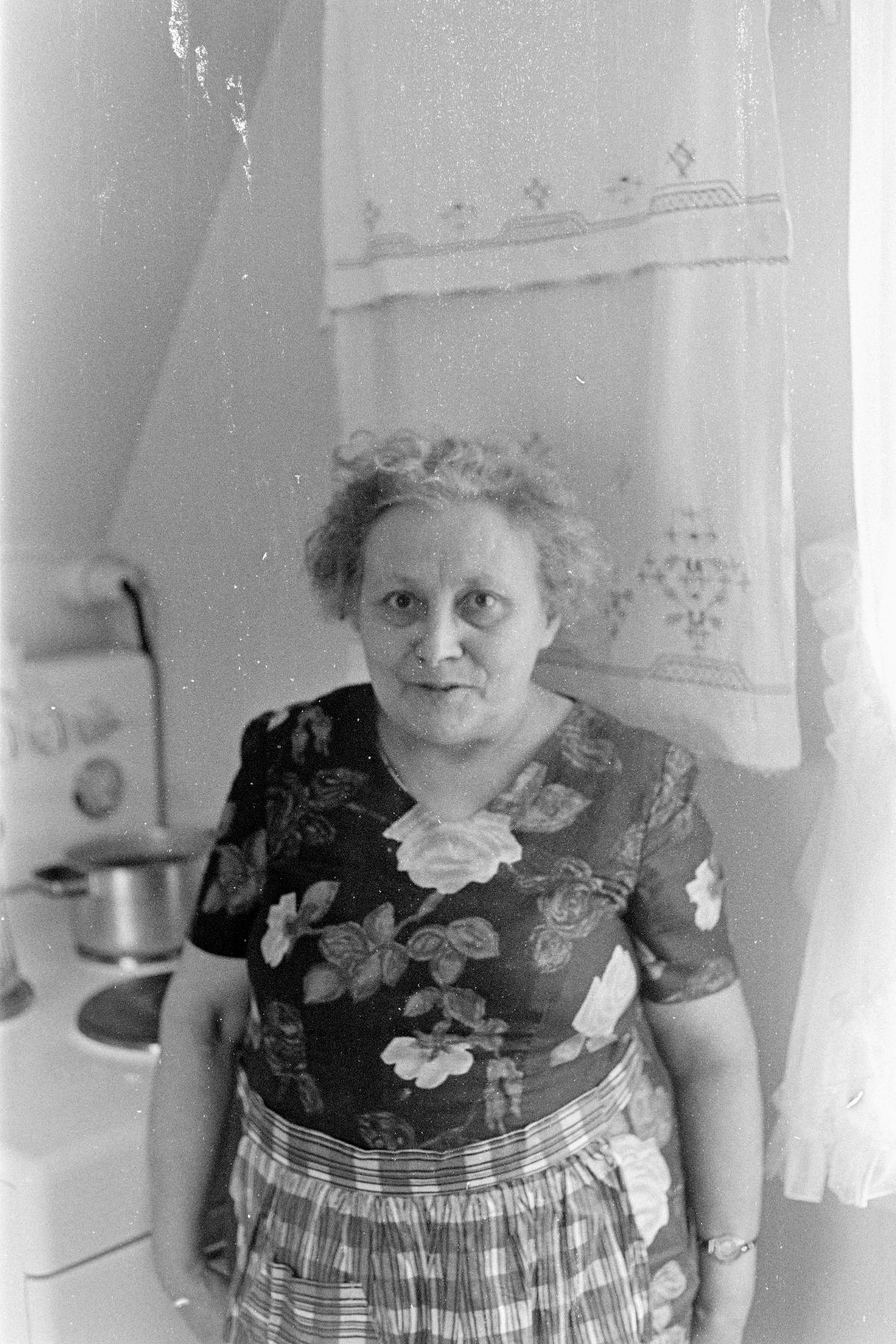 "Porträtt av en kvinna i ett kök som blivit intervjuad av paret Ruong. Israel Ruong antecknar: ""Toralv hämtade oss. Vi gjorde upptagningar hos Karl Pedersens. Karl Pedersen, 73 år, inspelades på band 26:2-27:1 och band 29:3 (fiske i snöstorm), jfr bild 15A och 9A-10A. En äldre bror till honom Petter Pedersen, som bor i närheten, inspelades på band 27:2-28, jfr bild 9:8,9. Han berättade bl a om björn. Björn har det funnits gott om på Senja (jfr Pelle Molins novell Senjens storbjörn) men nu är den utrotad. Vidare gjordes korta intervjuer med Johanne Østheim 69 år, band 29:1, Mildred Pedersen, band 29:2. Toralv körde oss sedan till Ole Pedersen, som bor i en gård alldeles i närheten. Från gårdarna i Kvauli, vilka ligger högt, har man en god utsikt över de statligt understödda myrodlingarna längre ned. Med Ole Pedersen (74 år) inspelades band 29:4-30 och band 32:1. Han berättade bl a om sitt sjömansliv. Han var bl a 1924 i Murmansk, som då var en stad av plank med 300 innevånare. Arkangelsk hade han också besökt och lastat trävaror, jfr bild 9:19A. Petrine Olsen, 54, inspelades på band 31:1 och Bella Aanesen 65 ảr pả band 31:2. Ole Pedersen är onkel till Bella Aanesen, som är moster till Toralv. Från Ole Pedersen körde vi till Agnus Seljevoll (45 år), som forskar om de samiska släkternas ursprung i Kvauliområdet, band 32:2, bild 9:21 (tillsammans med brodern)."""